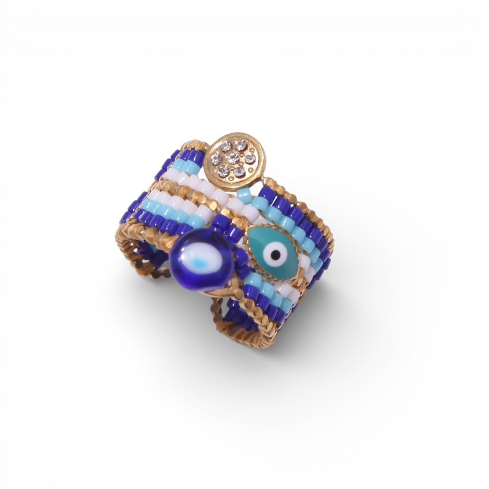 Bague fantaisie réalisée en perles fines tissées, montée sur une structure en acier ajustable, et ornée d’un motif œil bleu protecteur avec détails dorés. Inspirée de l’univers méditerranéen et des talismans traditionnels, cette bague incarne parfaitement l’esprit bohème chic de la collection Mykonos.