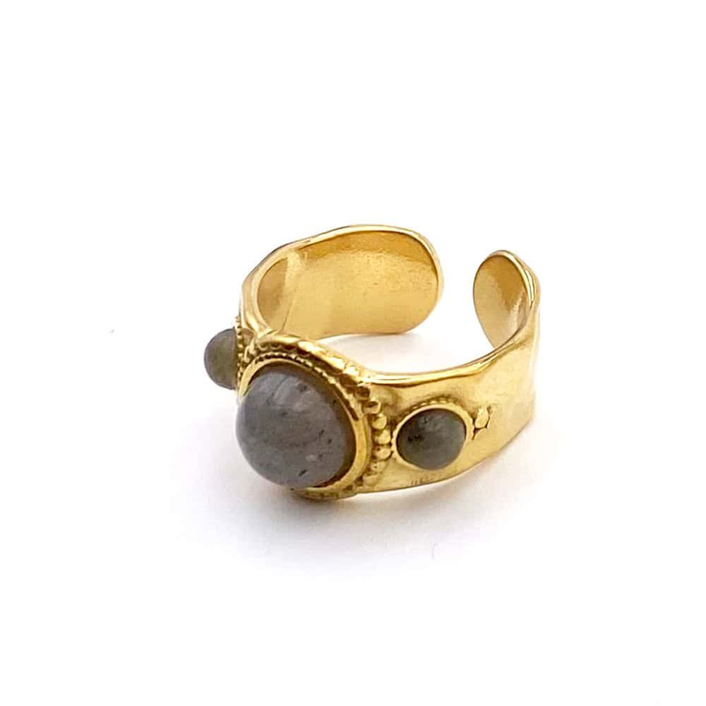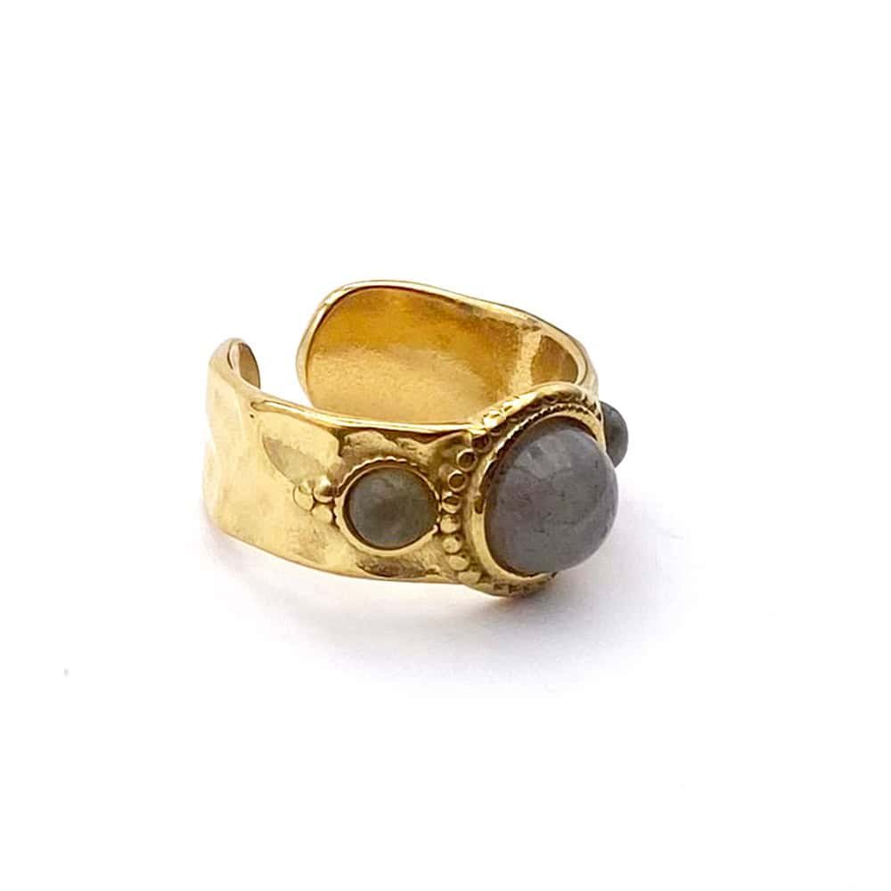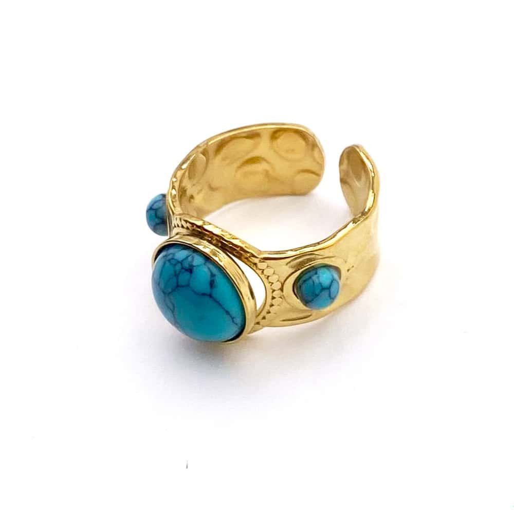 Affirmez votre style avec cette bague ajustable en acier martelé, ornée d’un cabochon central lumineux et de deux petits cabochons délicats sur les côtés. Un design raffiné et texturé qui apporte une touche d’élégance et de caractère à votre look.