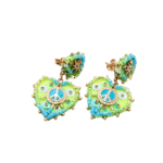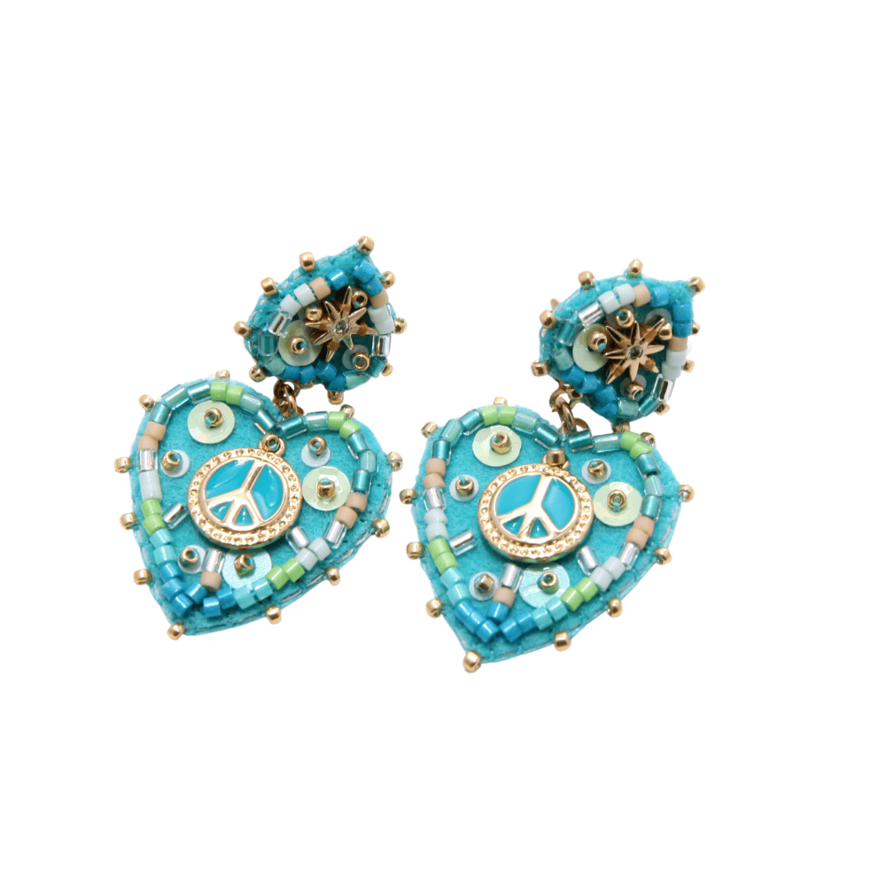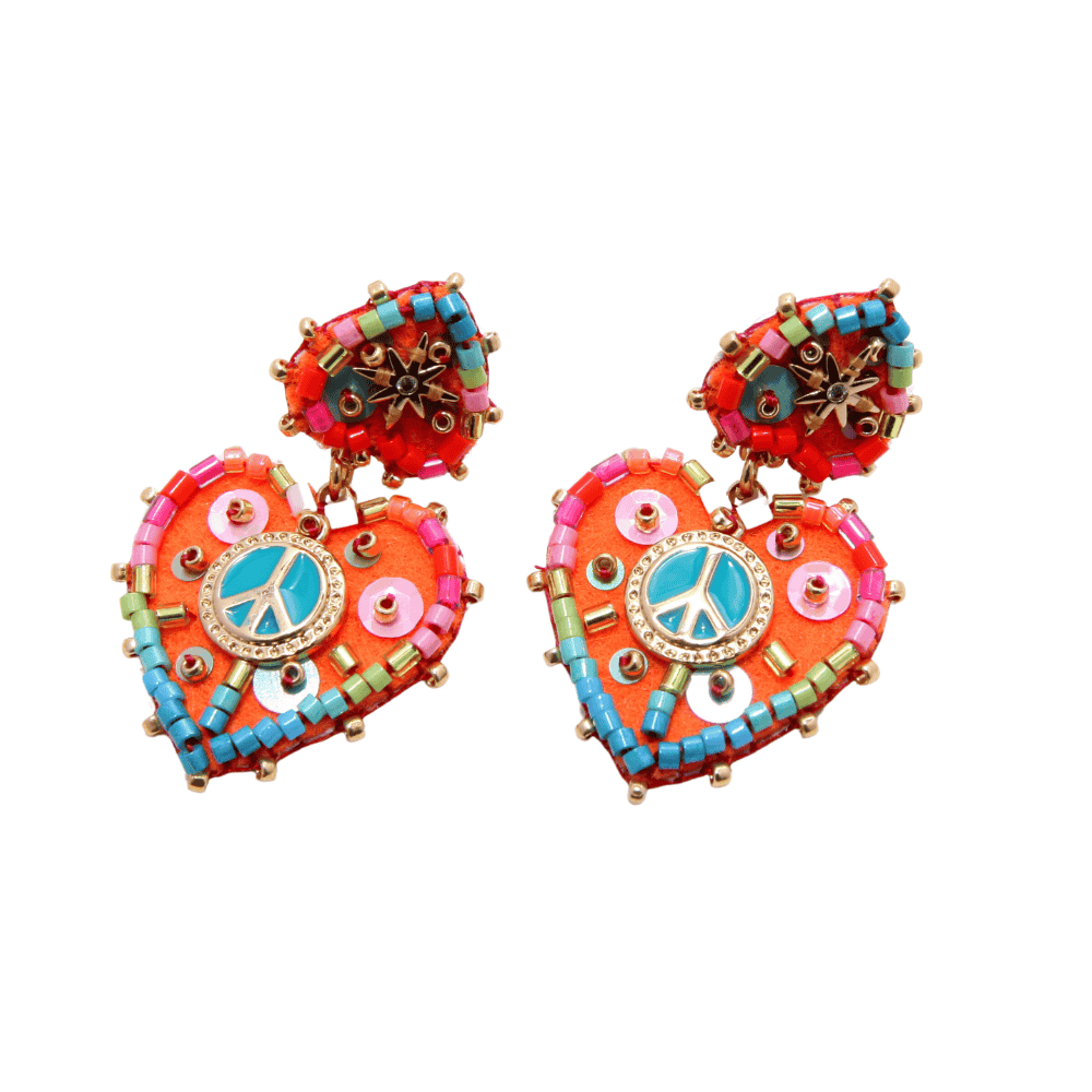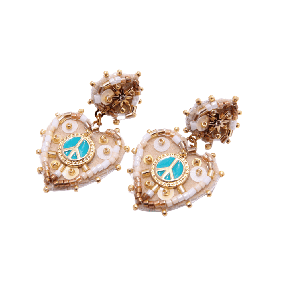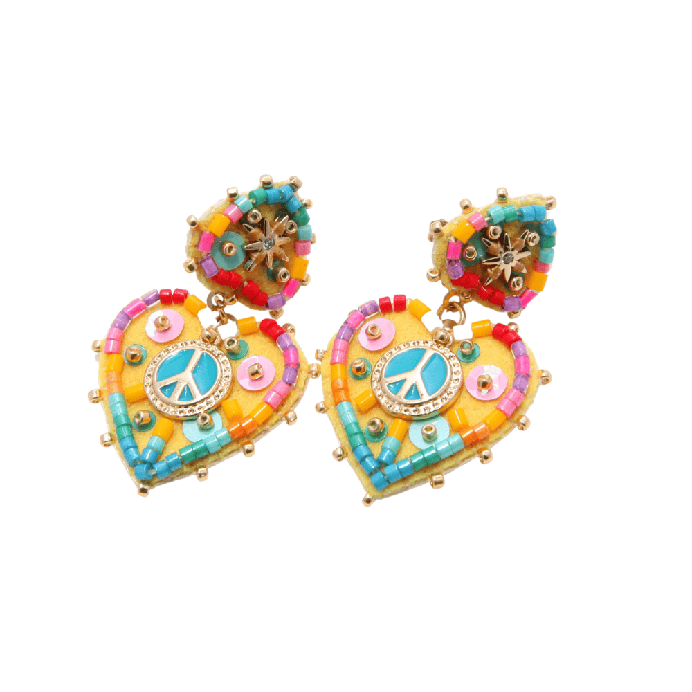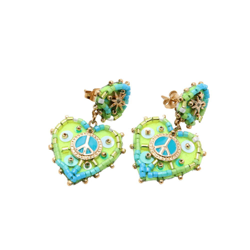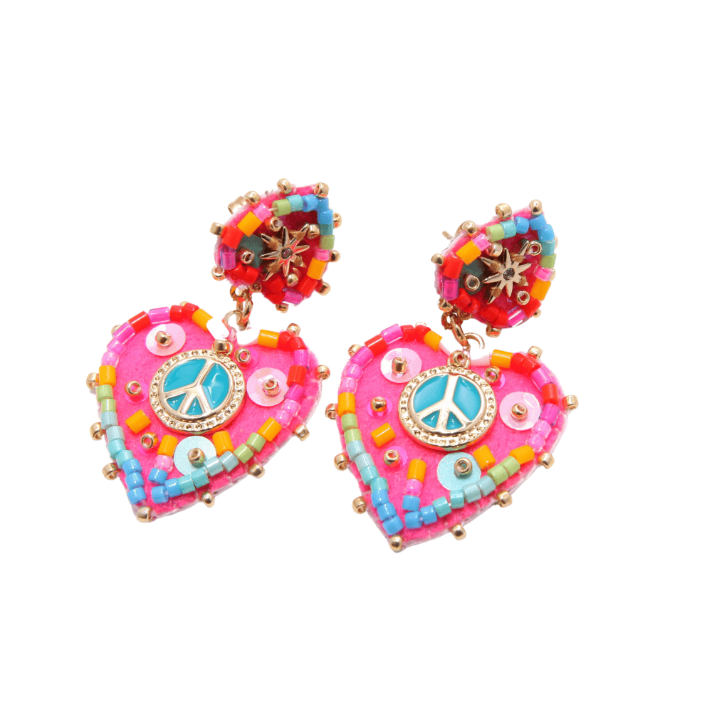 Boucles d’oreilles avec un cÅ“ur portant le symbole de la paix en son centre, confectionnées en feutrine douce et en laiton émaillé pour une touche à la fois chic et symbolique.
