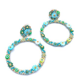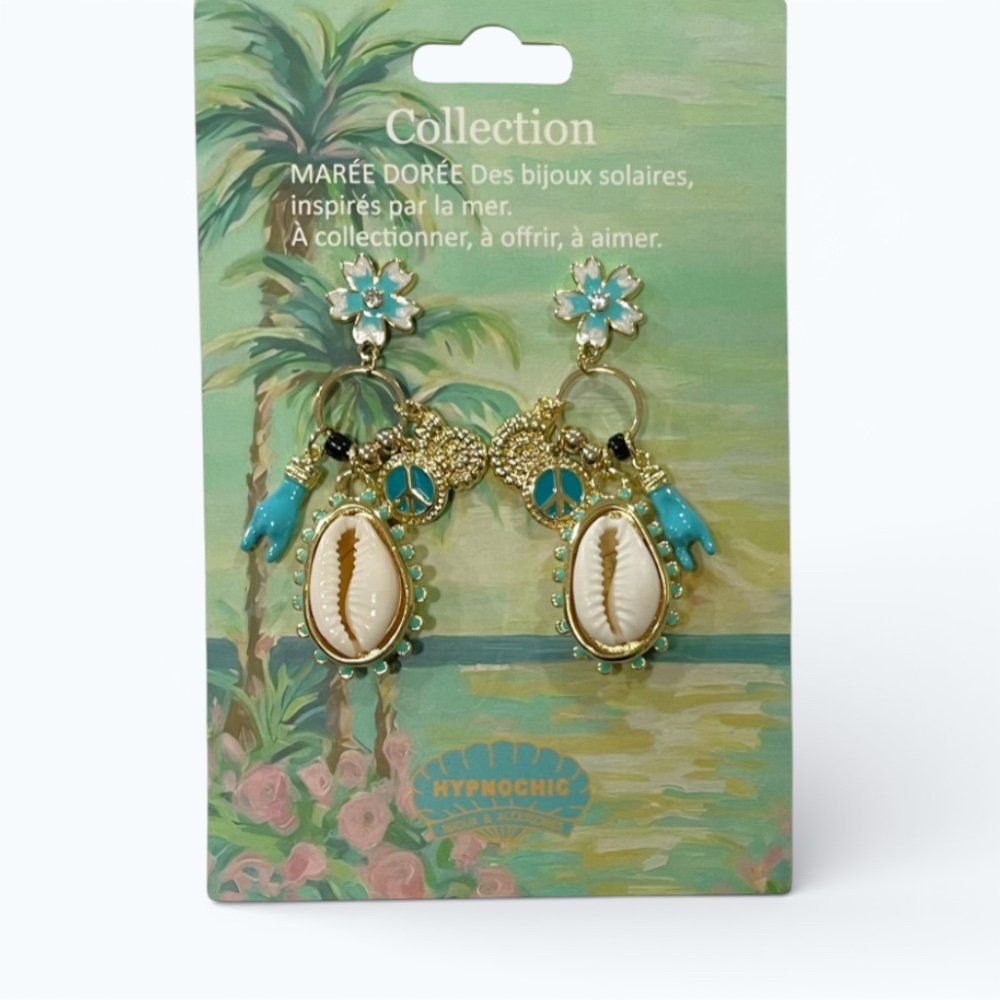 Boucles d’oreilles dorées composées d’un cauri central et de petits charms marins colorés.