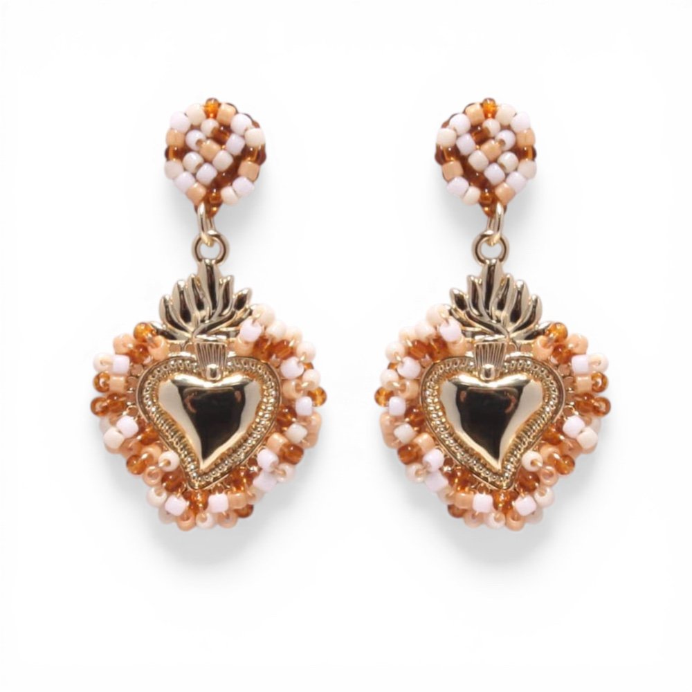 Les boucles d’oreilles Ex Voto Sacré Rosario sont réalisées en fines perles tissées et sublimées par un pendentif cœur sacré doré, symbole fort de protection et de spiritualité.