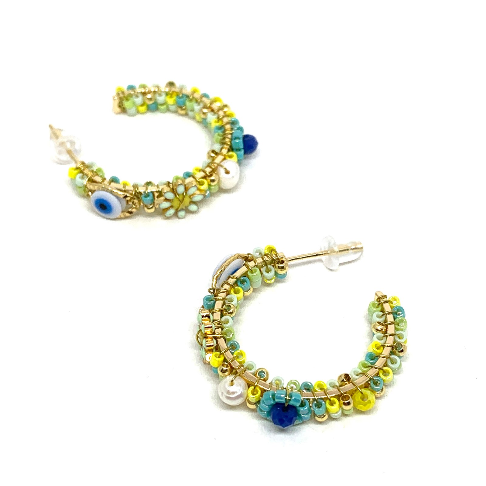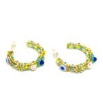 Boucles d’oreilles créoles composées de perles de Miyuki multicolores, de fleurs et de perles Oeil protecteur
