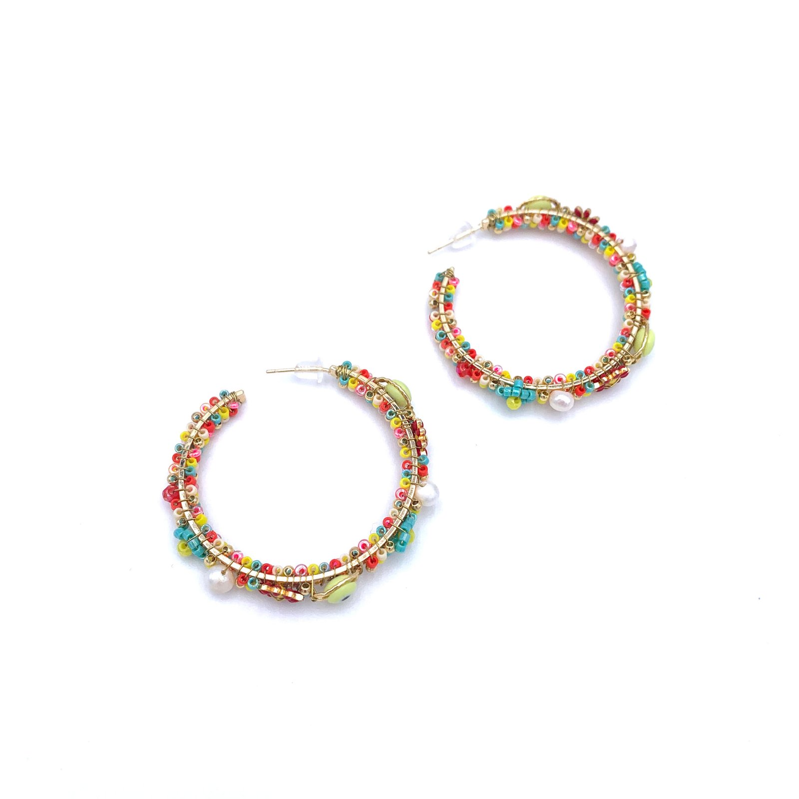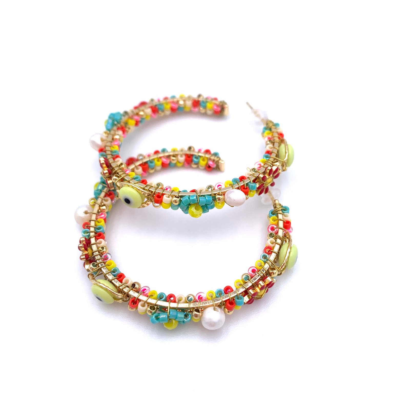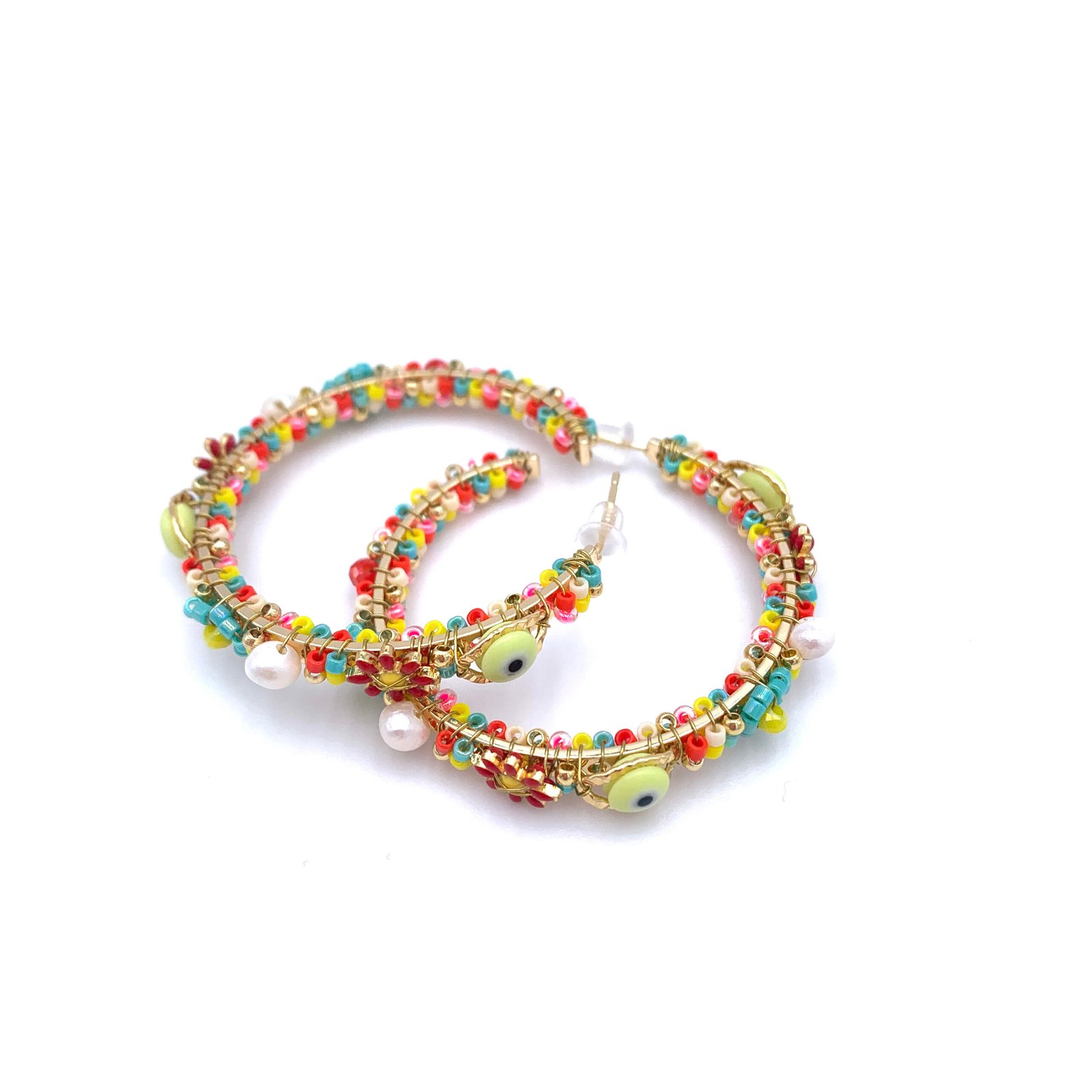 Boucles d’oreilles créoles composées de perles de Miyuki multicolores, de fleurs et de perles Oeil protecteur