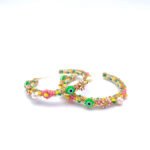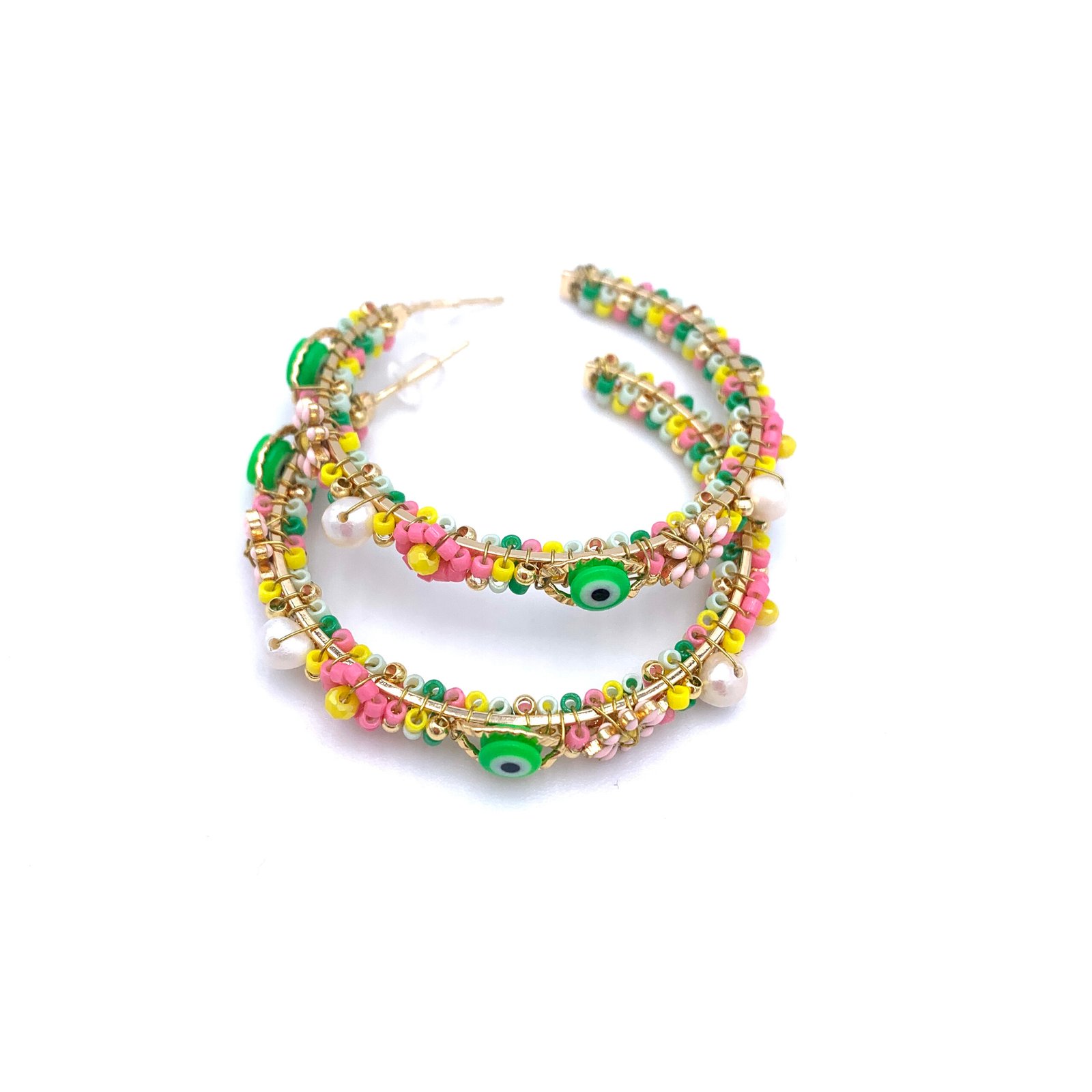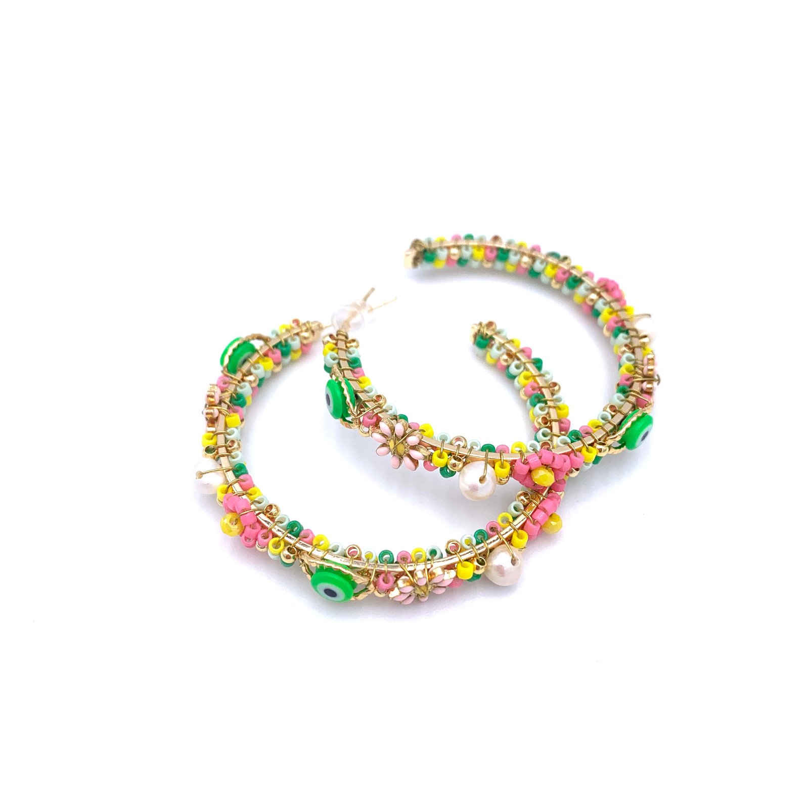 Boucles d’oreilles créoles composées de perles de Miyuki multicolores, de fleurs et de perles Oeil protecteur