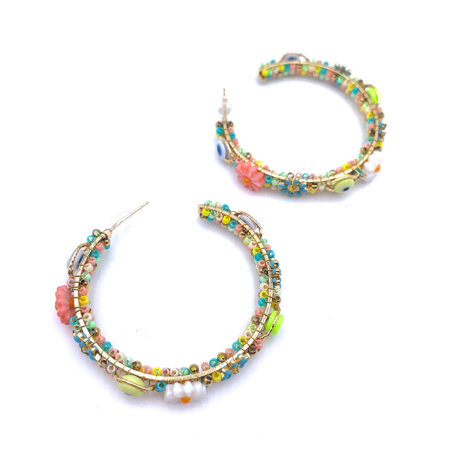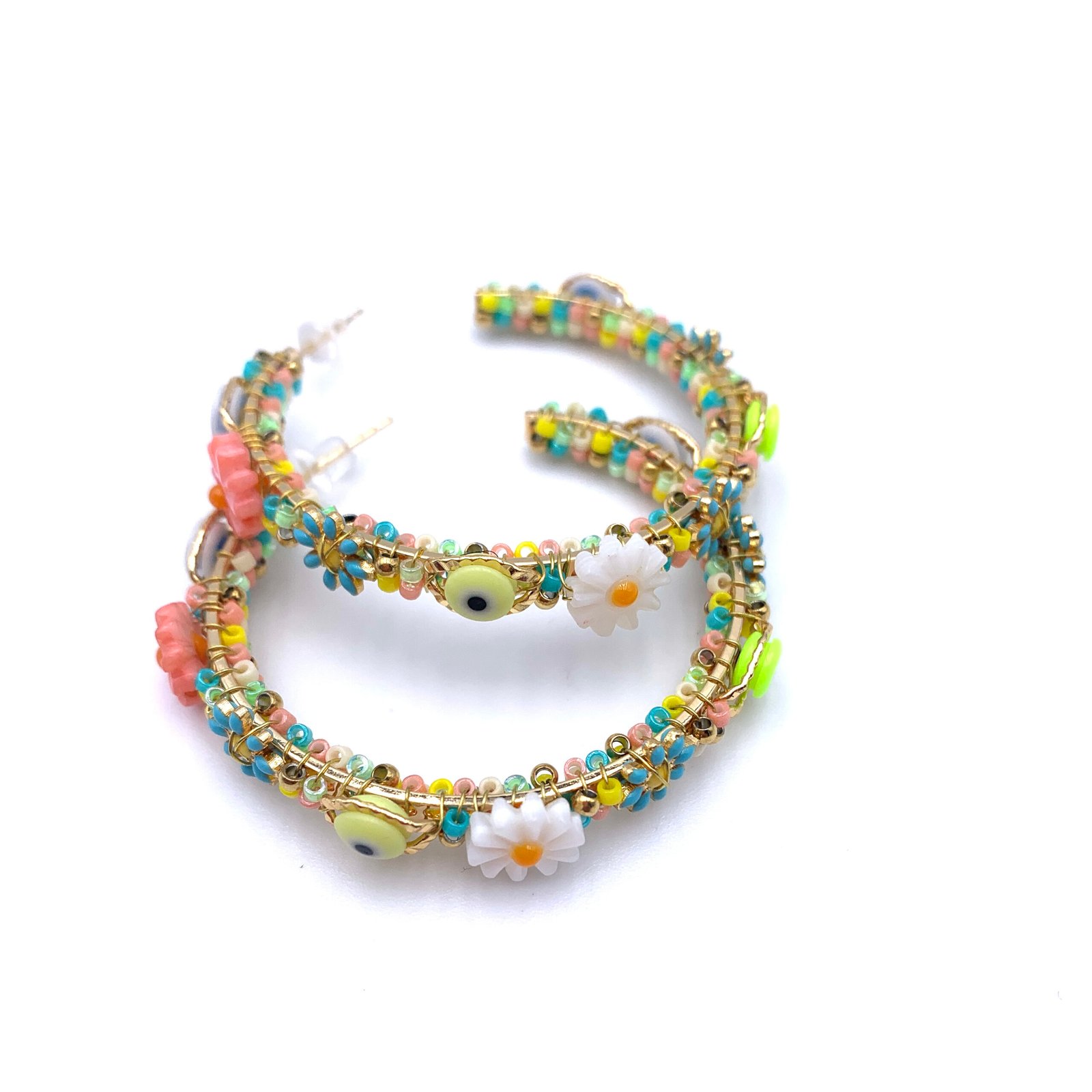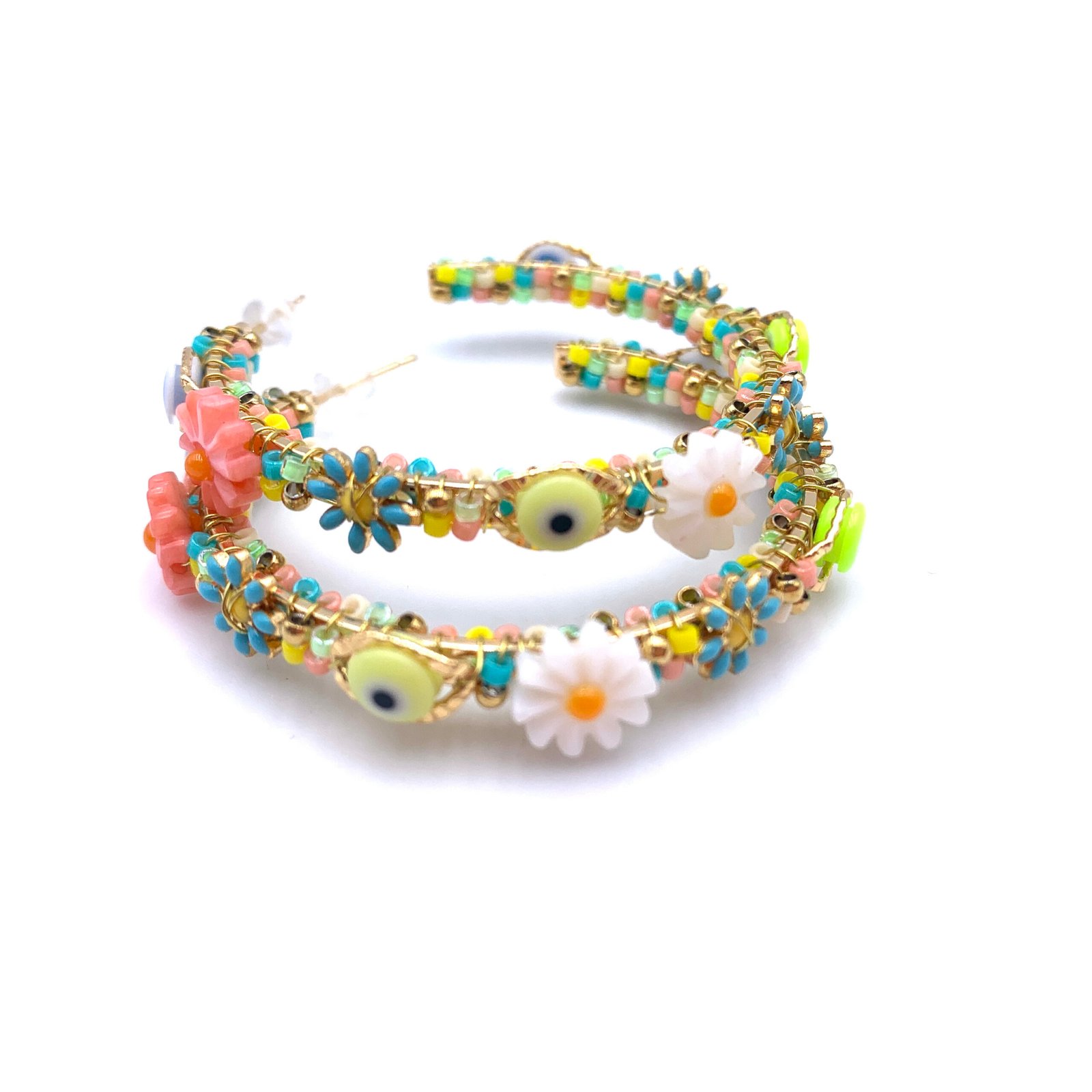 Boucles d’oreilles créoles composées de perles de Miyuki multicolores, de fleurs et de perles Oeil protecteur