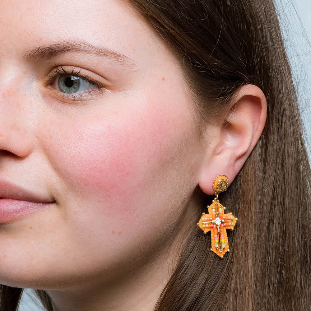 Boucles d’oreilles Croix en feutrine avec perles de Miyuki,perles dorées et strass central.