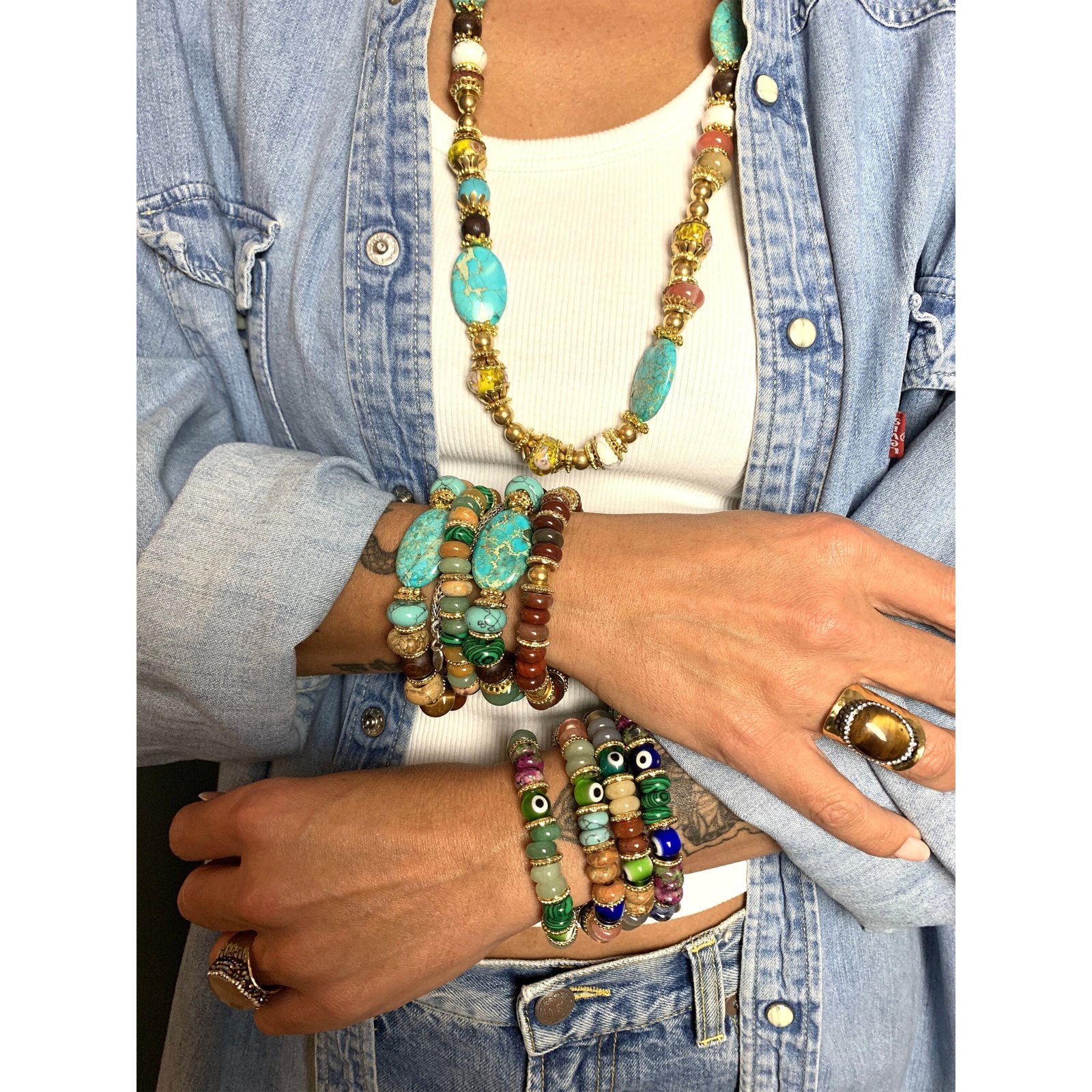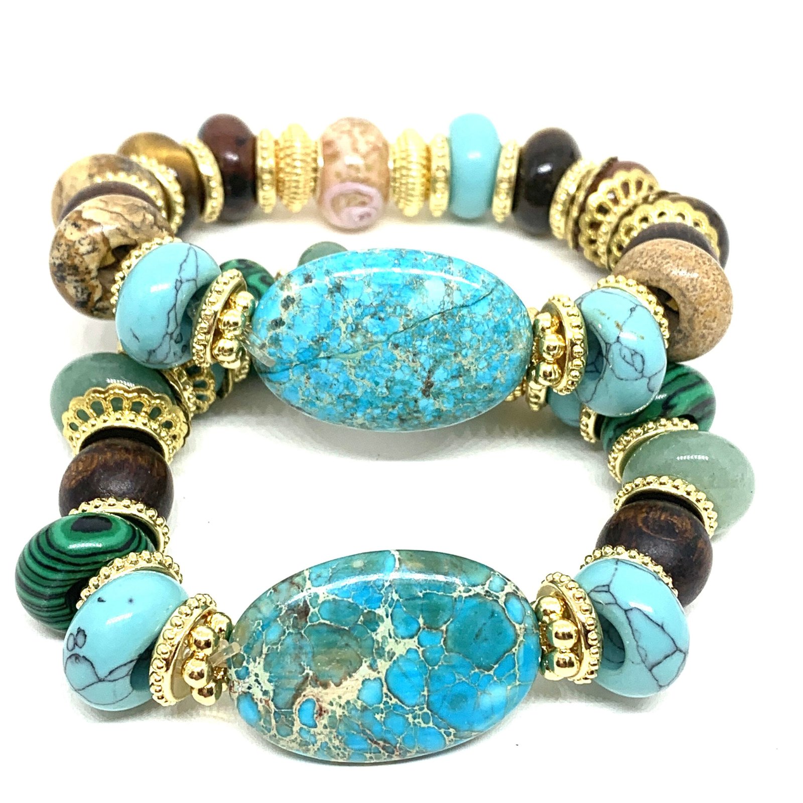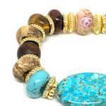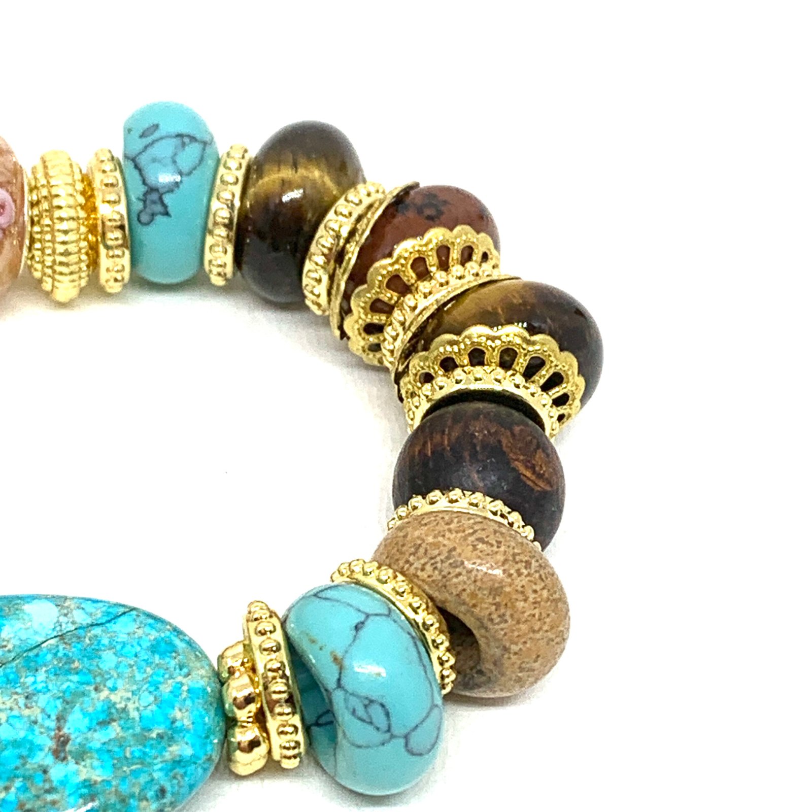 Bracelet sur fil élastique composé de pierres multicolores naturelles, de perles de bois, de perles de verre et de pièces dorées .