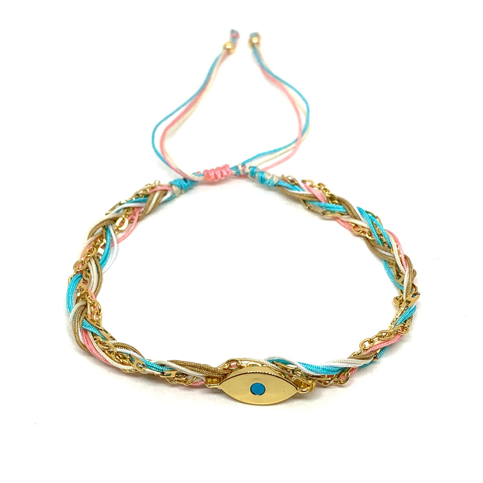 Bracelet composé de cordons tressés multicolores et d’une chaine dorée en acier inoxydable.