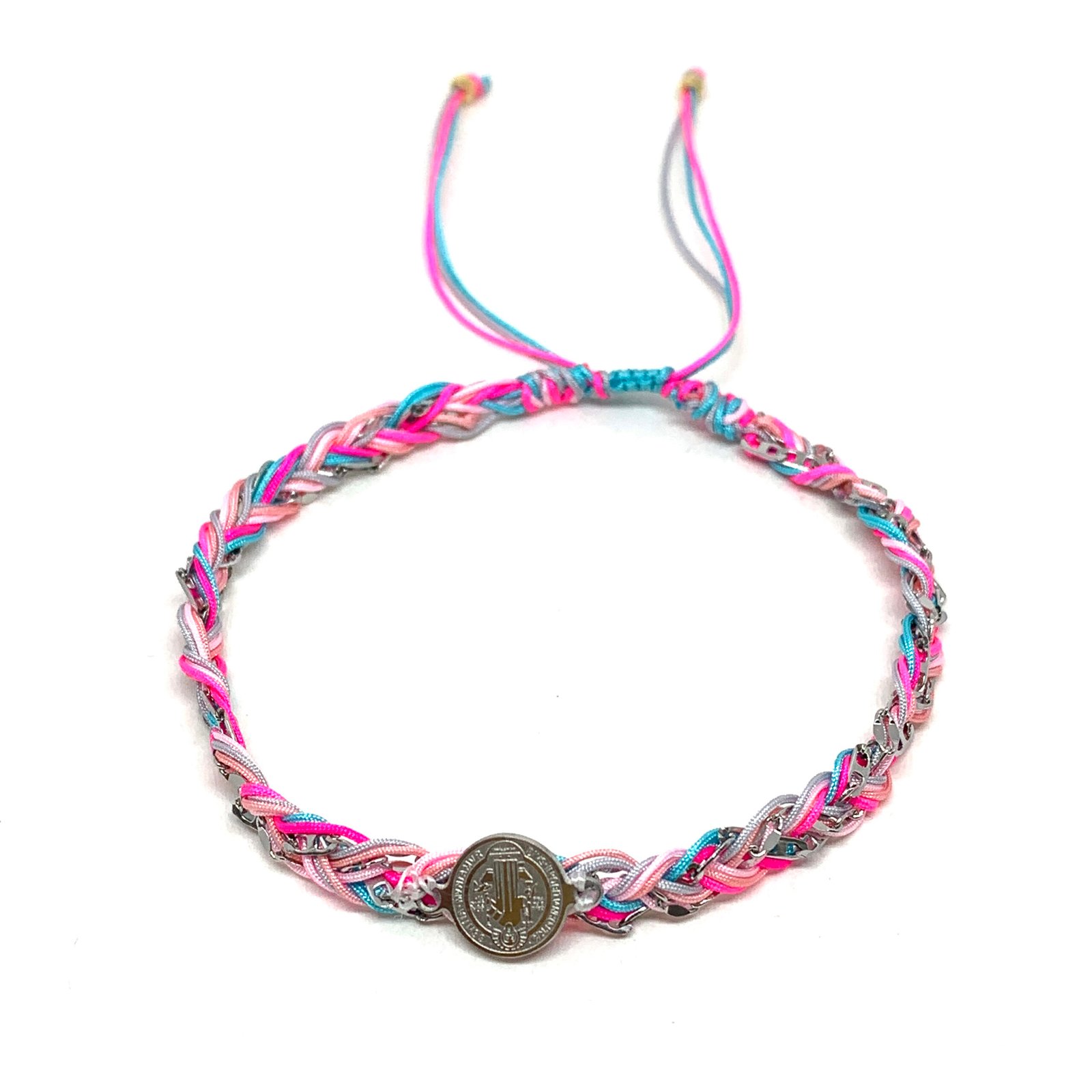 Bracelet composé de cordons tressés multicolores et d’une chaine dorée en acier inoxydable.