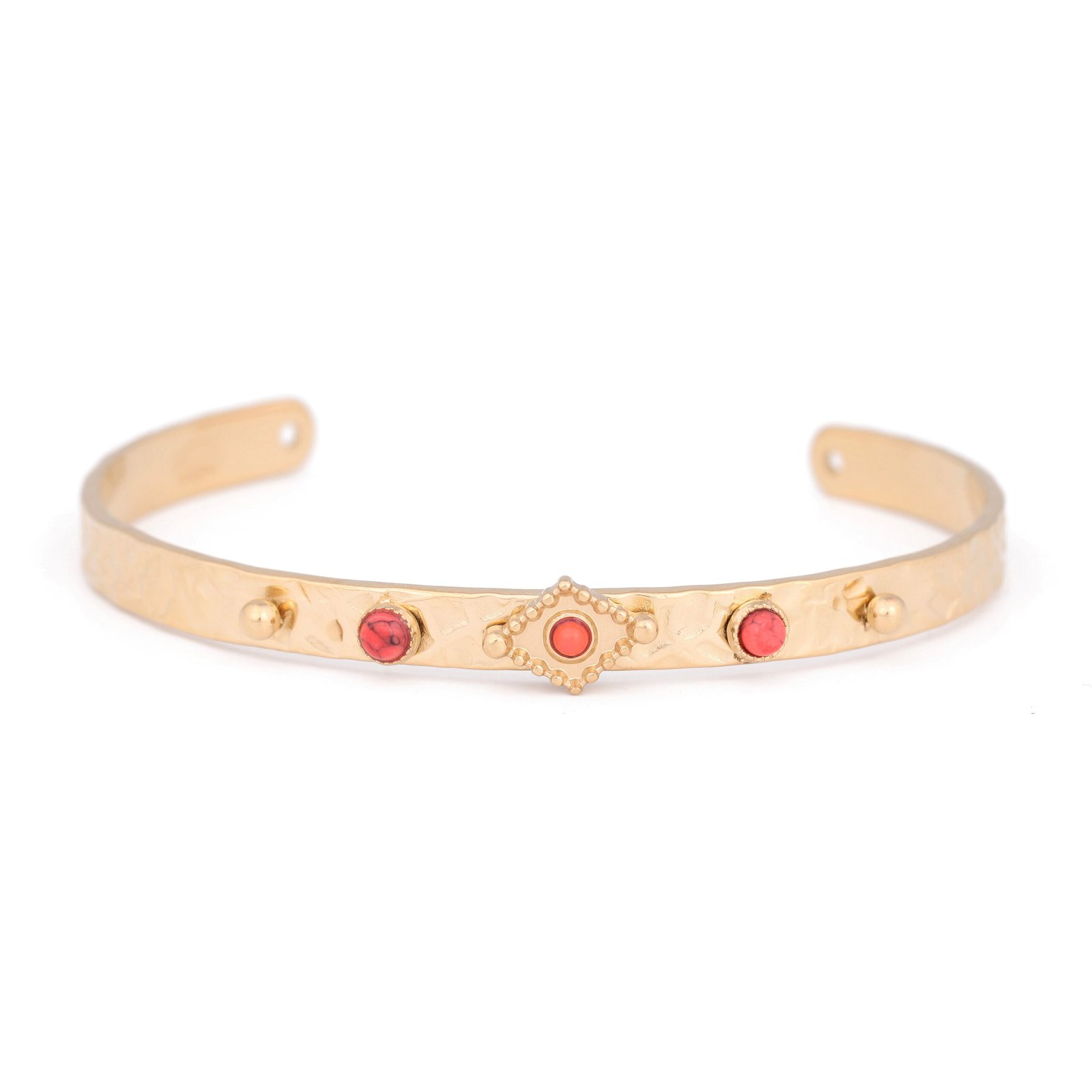 Le bracelet est surmonté de 3 cabochons en poudre de pierre d’agathe de couleur rouge.