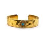 Ce bracelet jonc en acier martelé, sublimé par un cabochon central façon soleil. Ce bijou unique séduit par son design texturé et son éclat subtil, idéal pour rehausser vos tenues avec élégance.