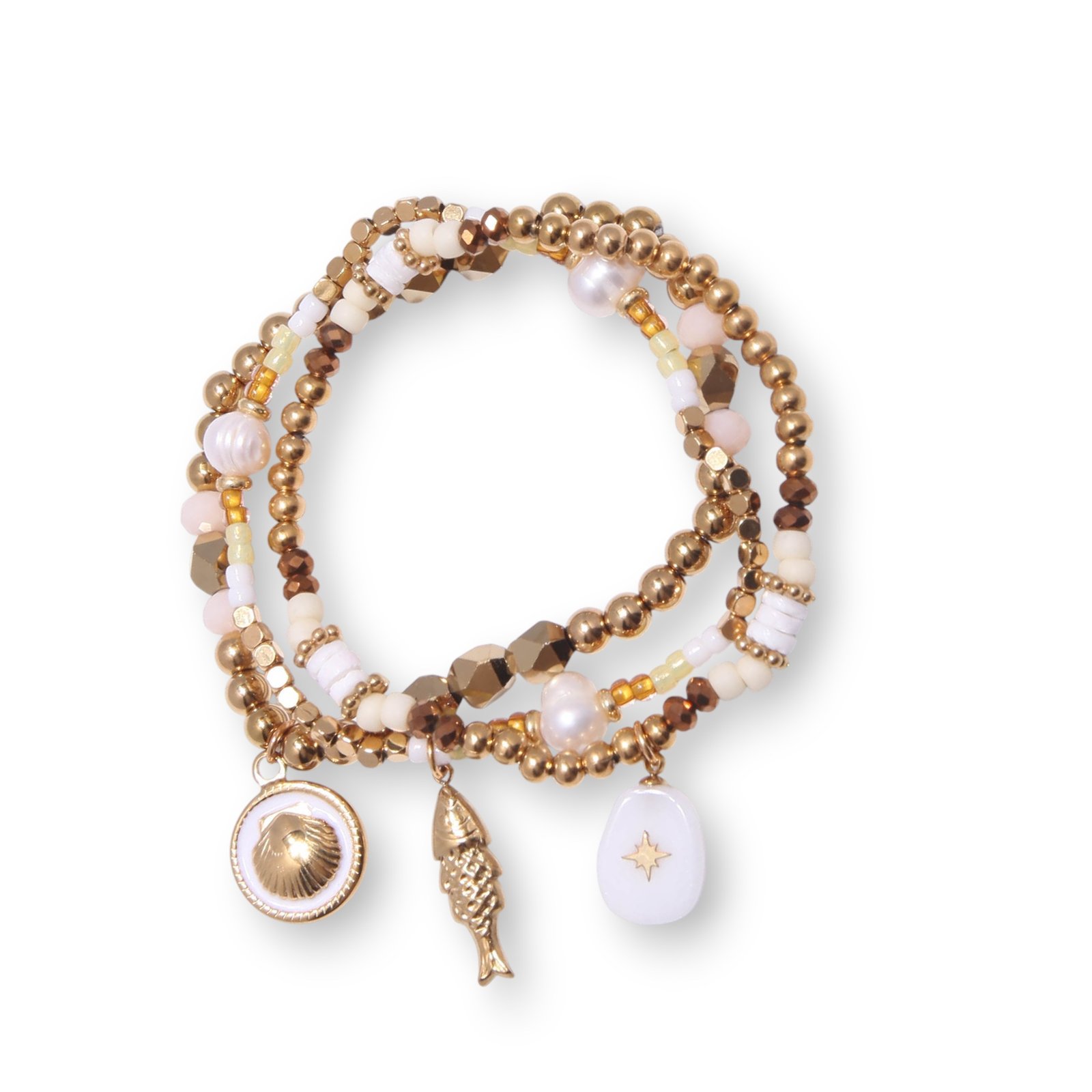 Série de 3 bracelets fantaisie assortis, montés sur fil élastique, composés de perles décoratives et de charms en acieraux finitions dorées. Chaque trio associe couleurs harmonieuses et symboles forts pour un rendu bohème chic facile à porter au quotidien.