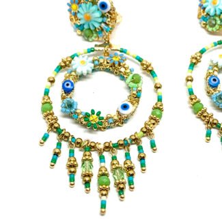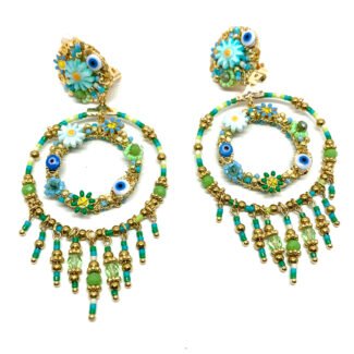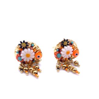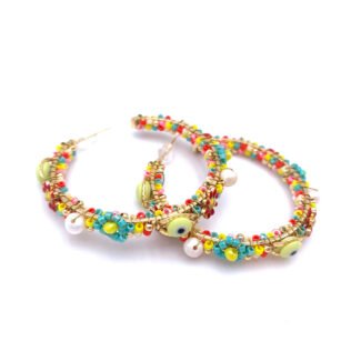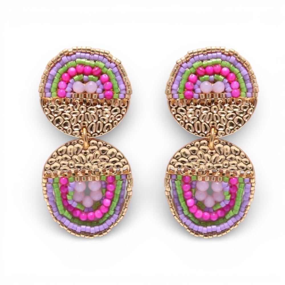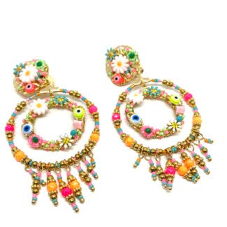 Boucles d’oreilles clip bohème chic brodées de perles fines, base dorée martelée. Déclinées en 5 coloris solaires. Produit tendance à fort potentiel boutique.