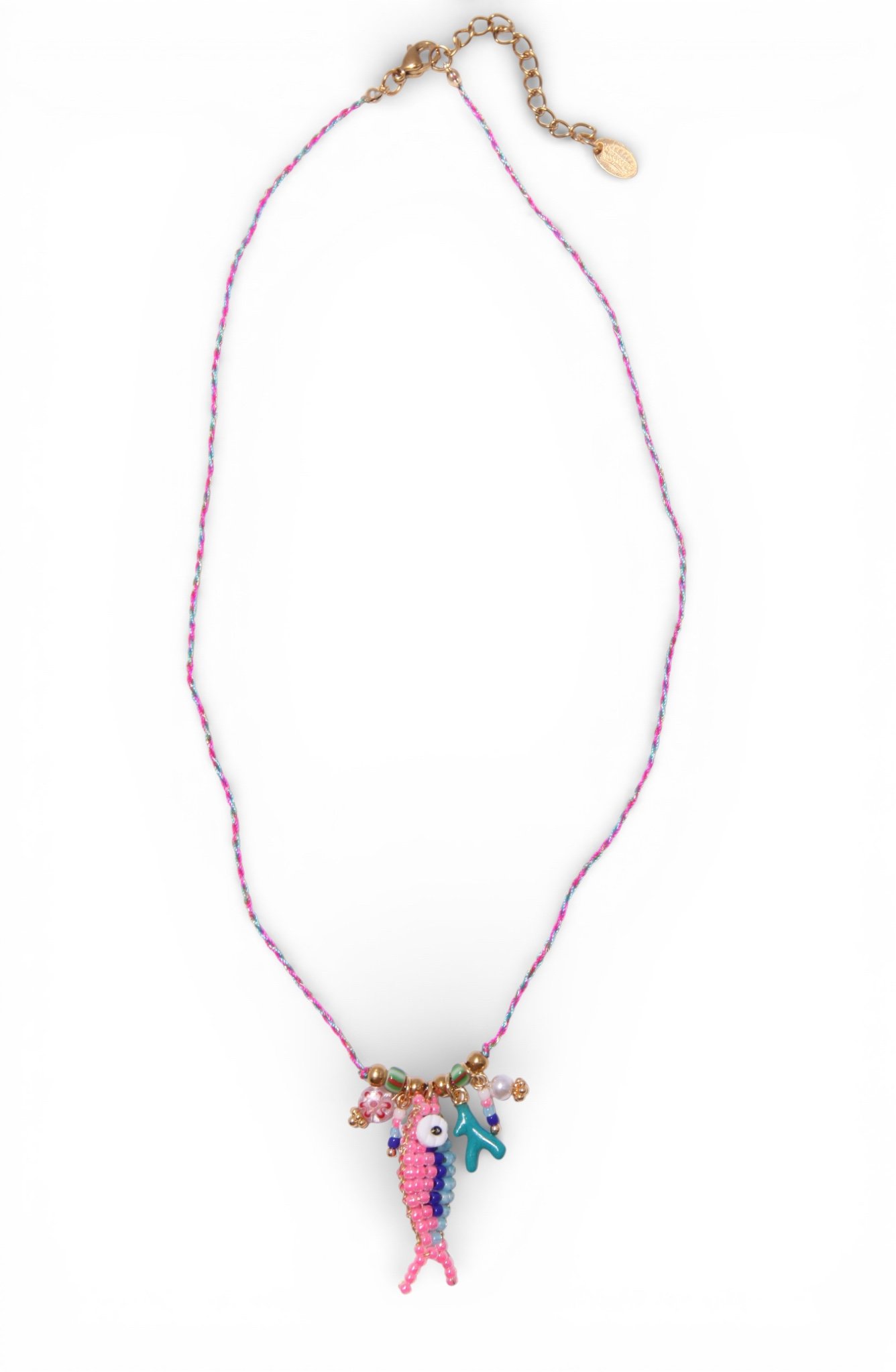 Collier fantaisie composé d’un cordon fin tressé, orné de charms marins tissés représentant un poisson stylisé, accompagnés de petites perles décoratives et de détails dorés. Inspiré de l’univers solaire et ludique de la collection Marée Dorée, ce collier incarne parfaitement l’esprit bohème chic et estival de la marque.