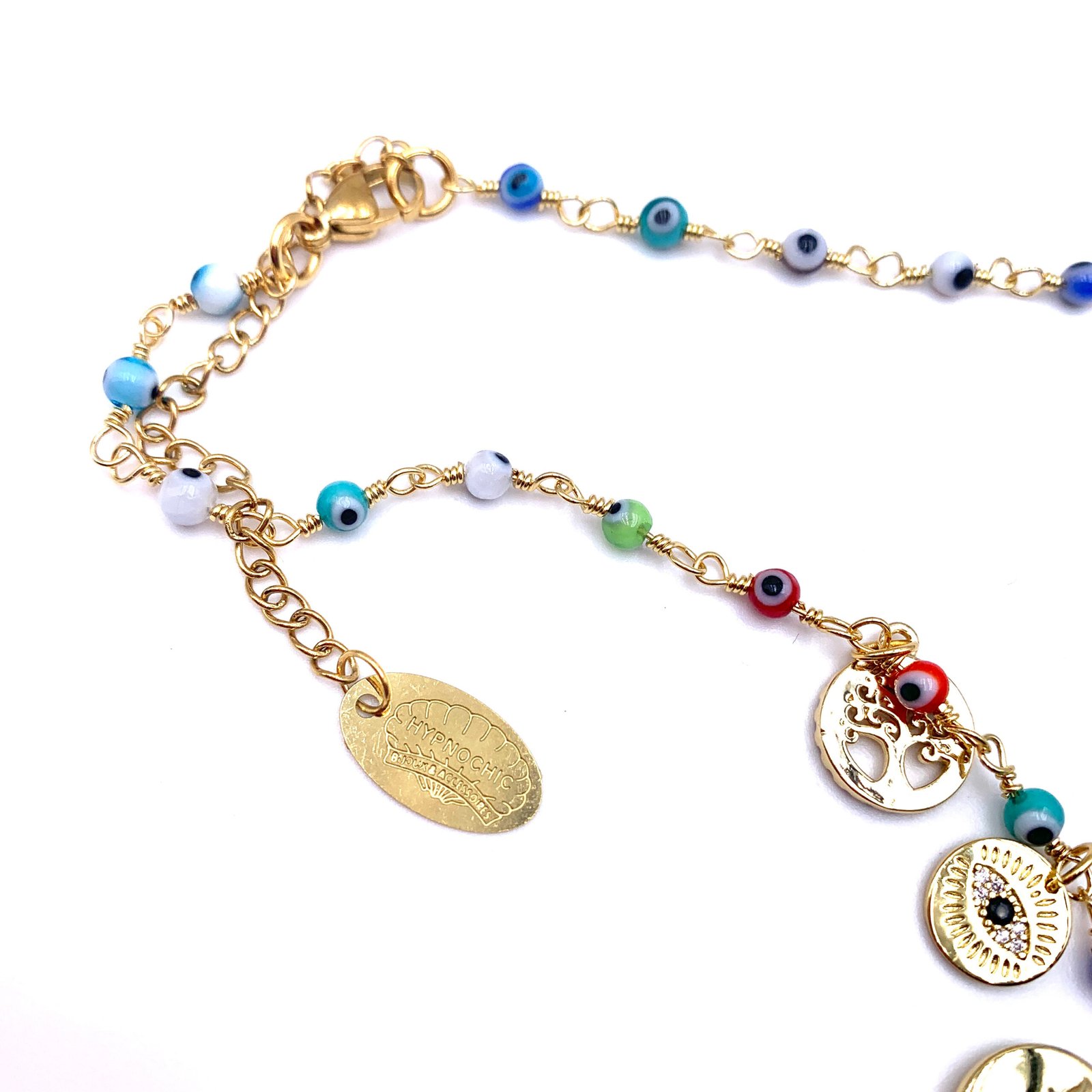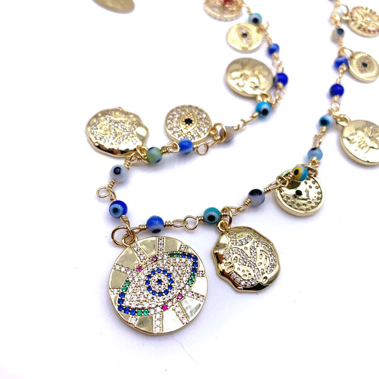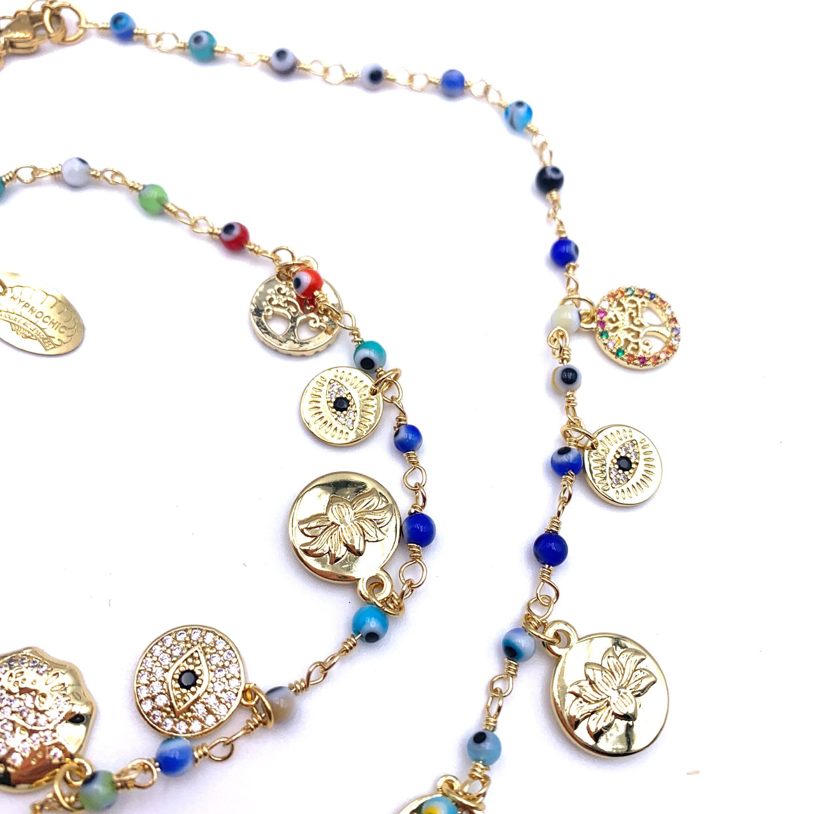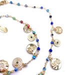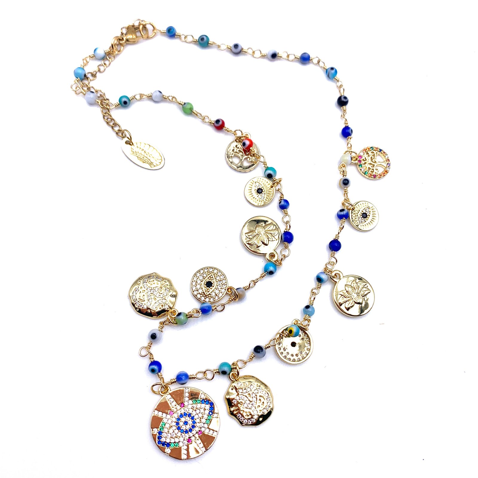 Le collier est composé de perles en pâte de verre et de breloques porte-bonheur.
