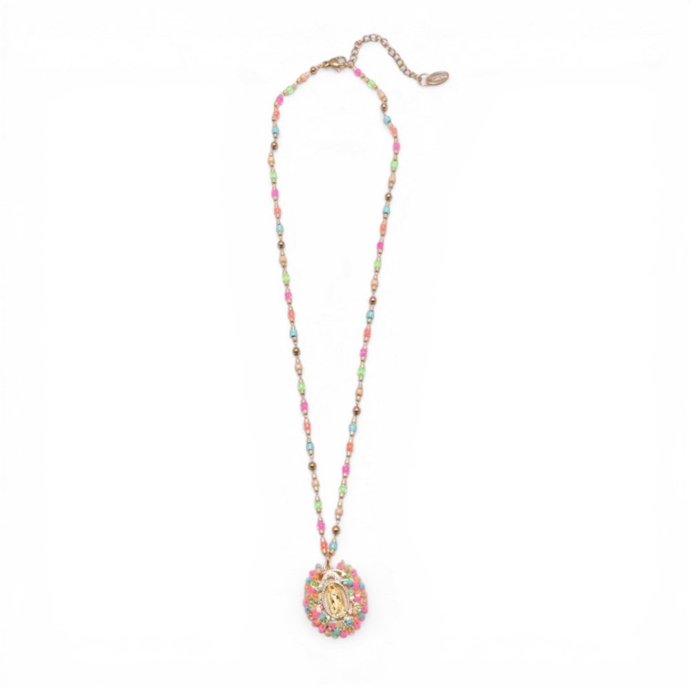 Le collier Marie Rosario est réalisé en fines perles assemblées avec précision et sublimé par un pendentif représentant la vierge Marie, symbole de protection et de spiritualité.