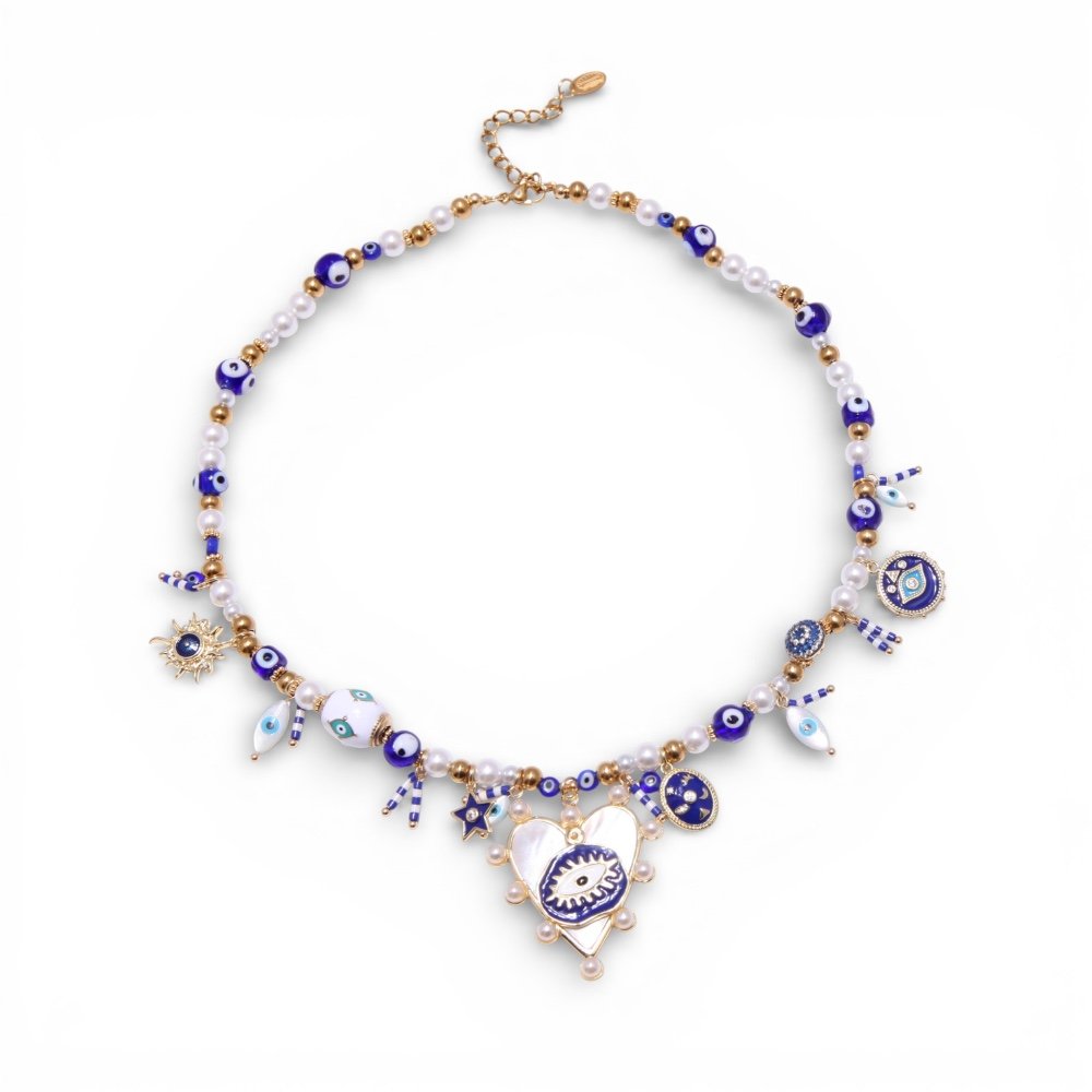 Collier emblématique de la collection Mykonos, inspiré des talismans méditerranéens et de l’iconique œil bleu protecteur.