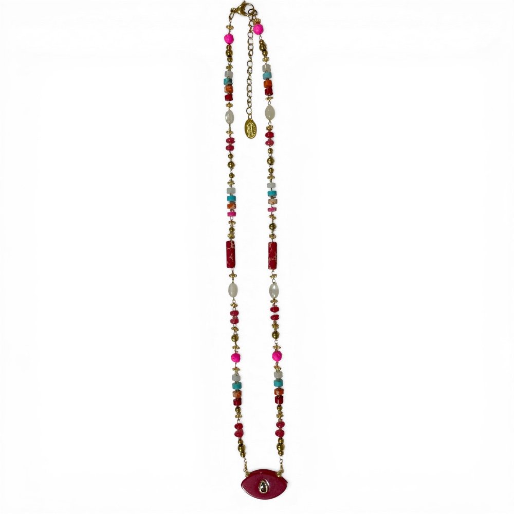 Colliers talismans ornés d’yeux protecteurs, déclinés en trois couleurs : rouge multicolore, turquoise et marron, sur acier doré.
