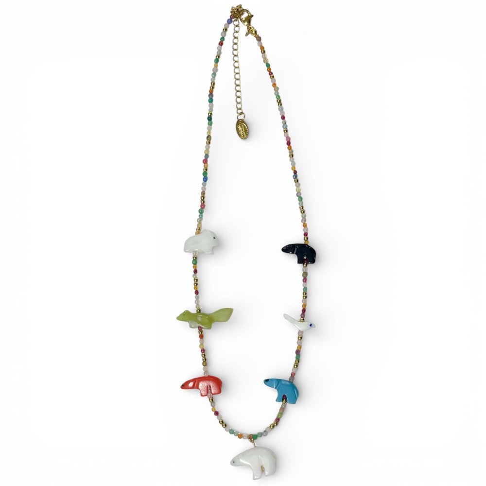 Collier bohème chic composé de perles en pierre naturelle de 2 mm et d’animaux gravés dans la pierre. Véritable bijou talisman, le Totem Sacré allie symbolique, élégance et énergie solaire. Un best-seller idéal pour la vente boutique