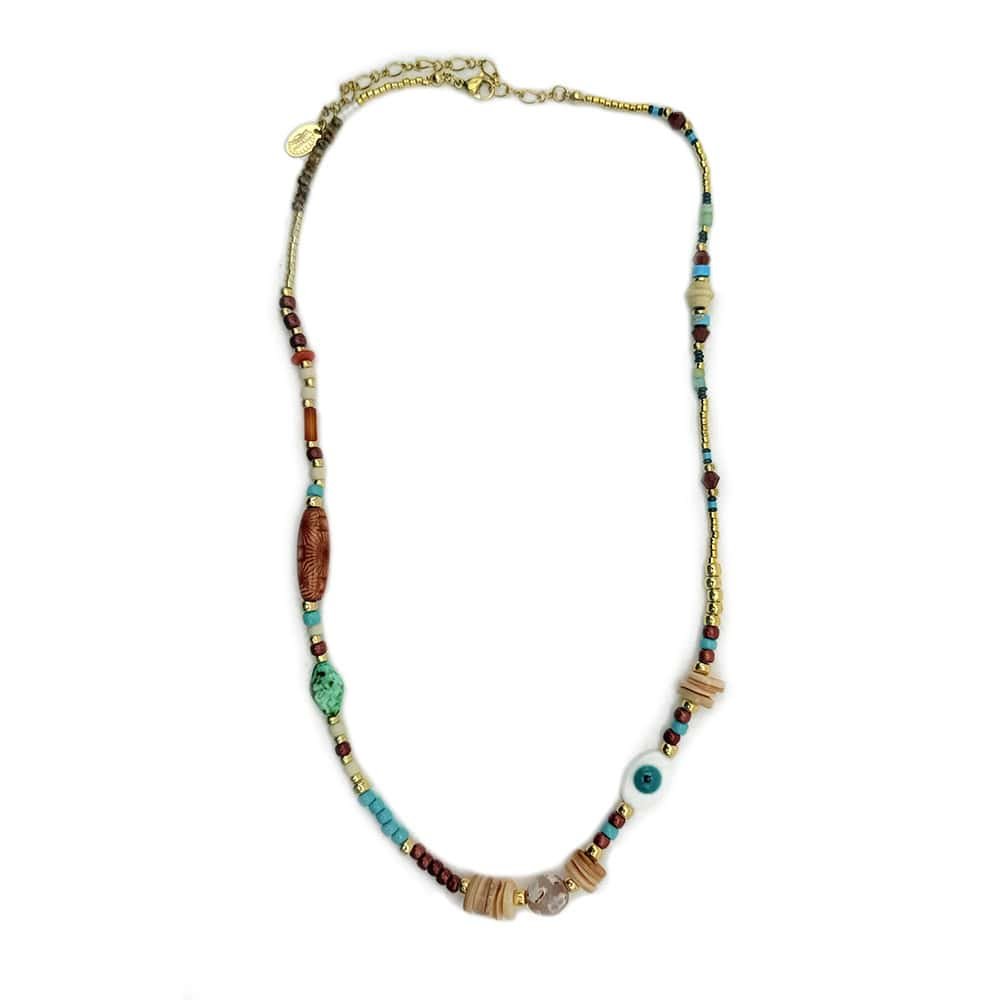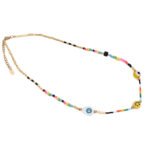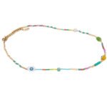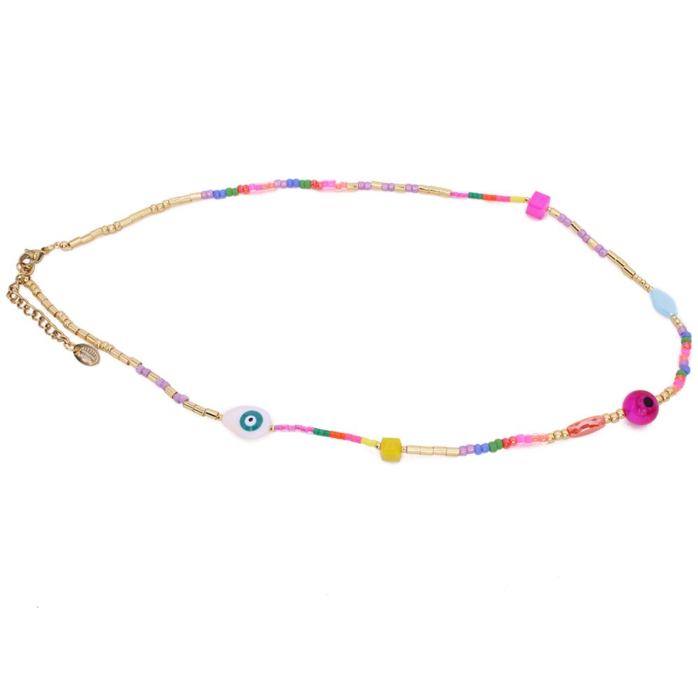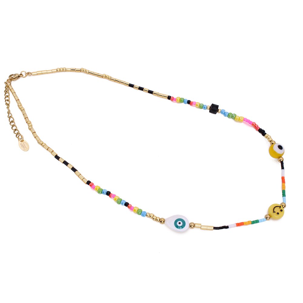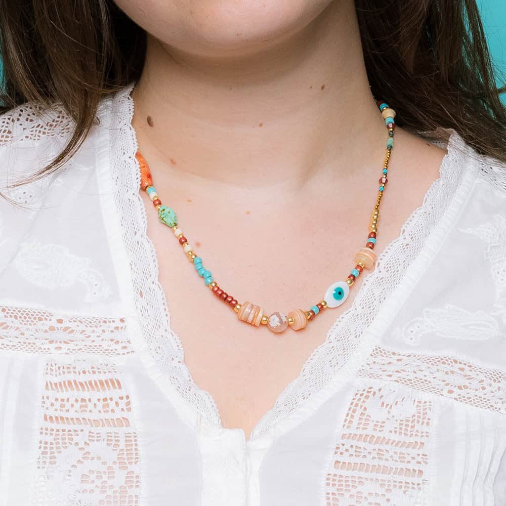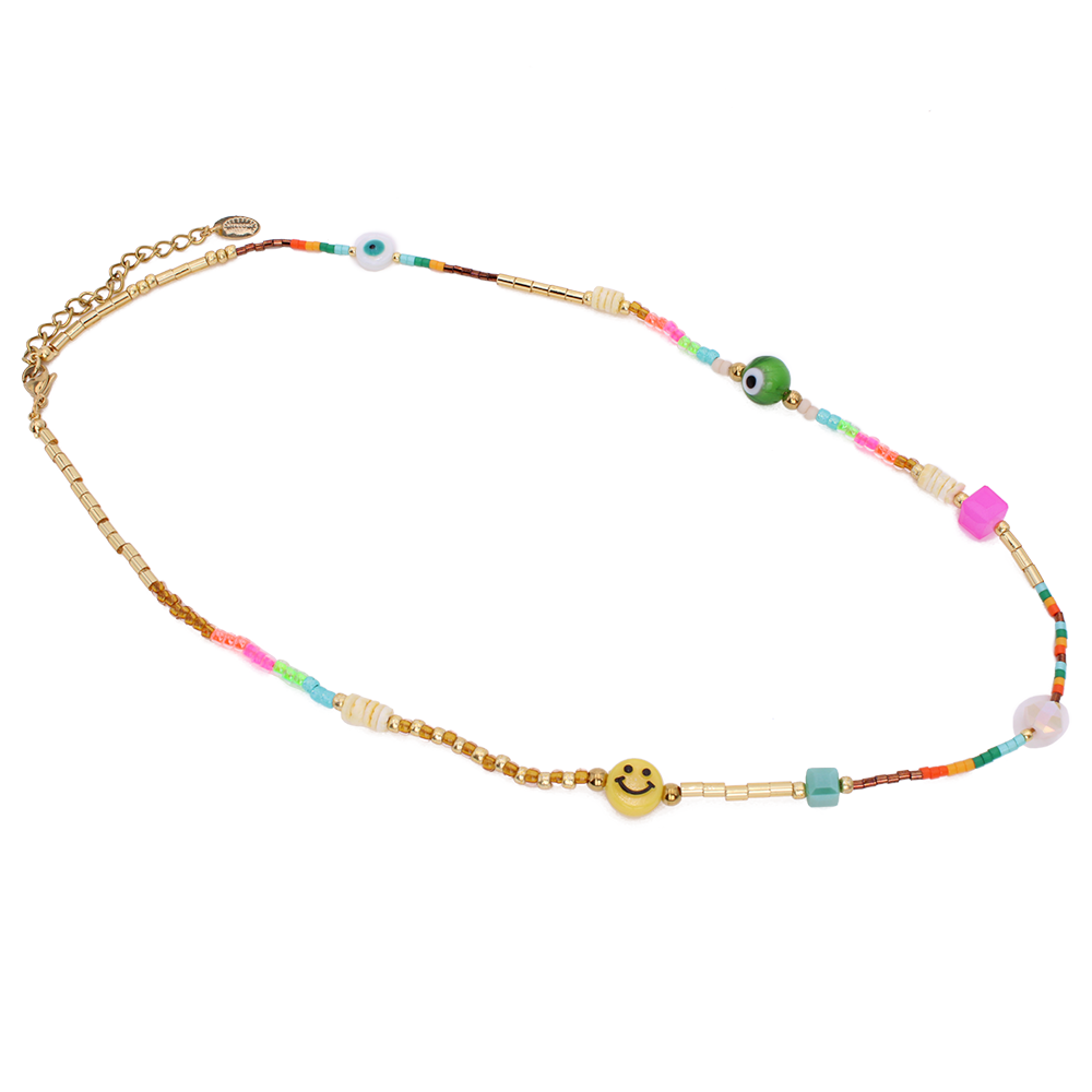 Le Collier Vamos Summer est un bijou multi-usage monté sur fil, composé d’un assemblage de perles colorées et de détails ludiques d’inspiration estivale (œil, smiley, perles fantaisie selon modèles).