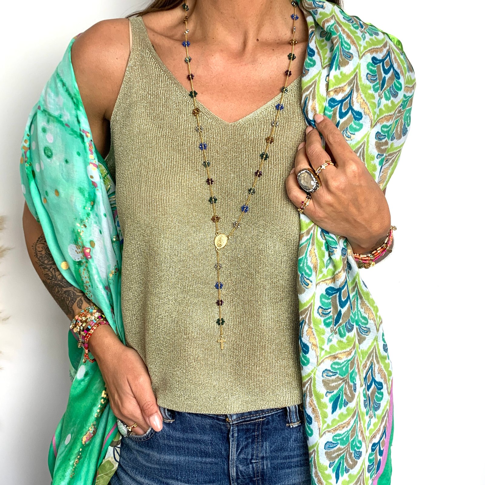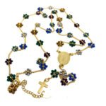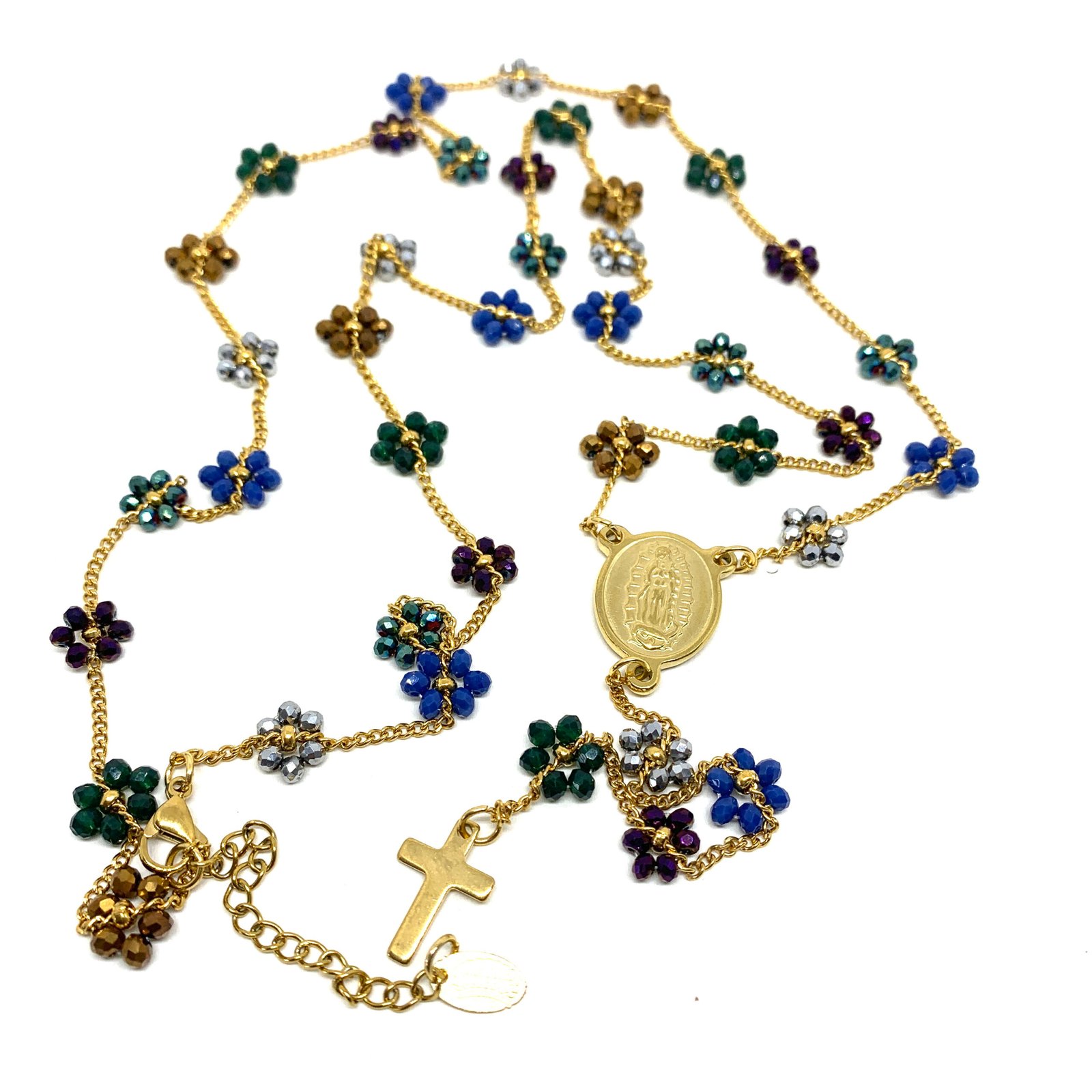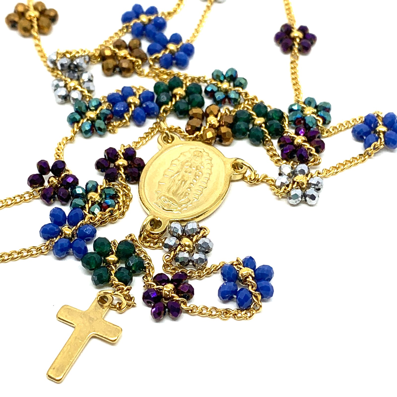 Collier sautoir avec fleurs en perles cristal sur chaine plaqué or