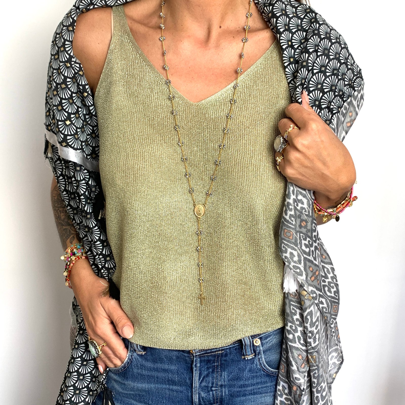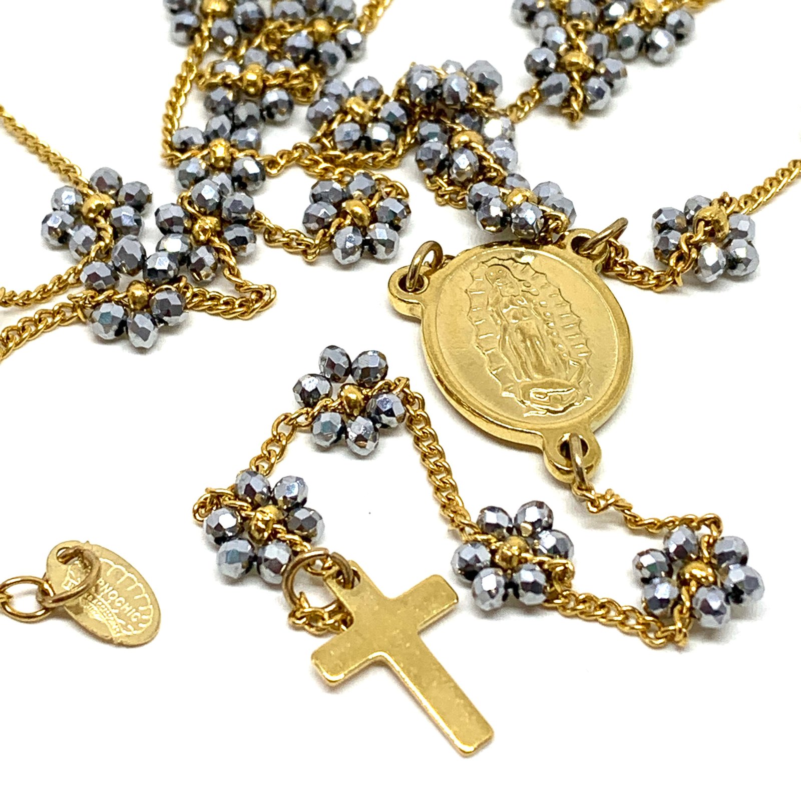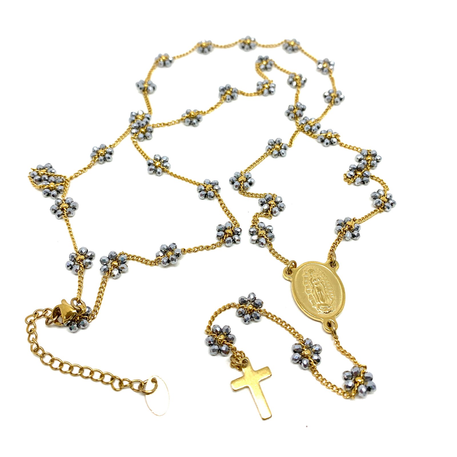 Collier sautoir avec fleurs en perles cristal sur chaine plaqué or