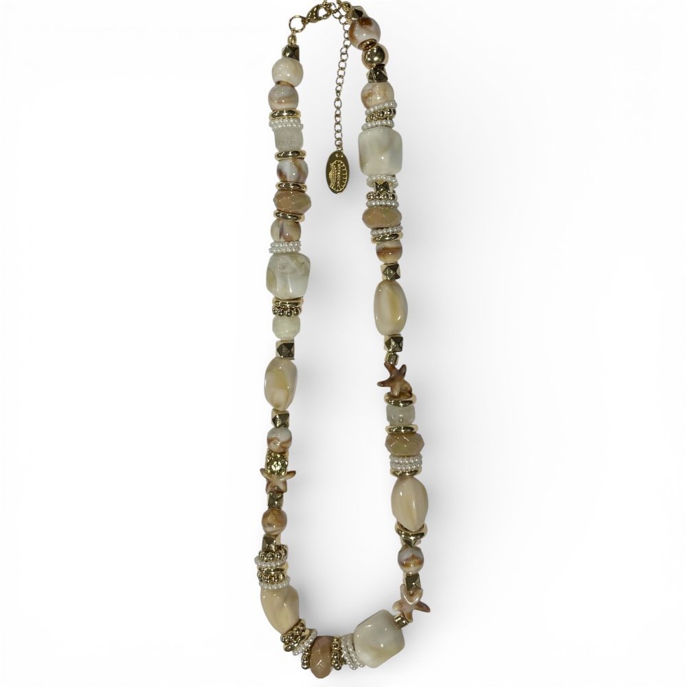 Collier fantaisie composé de perles aux tons naturels, aux formes organiques et irrégulières, associées à des détails dorés. Inspiré de l’univers solaire et élégant de la collection Marée Dorée, ce collier séduit par son esprit bohème chic et sa palette douce et lumineuse.