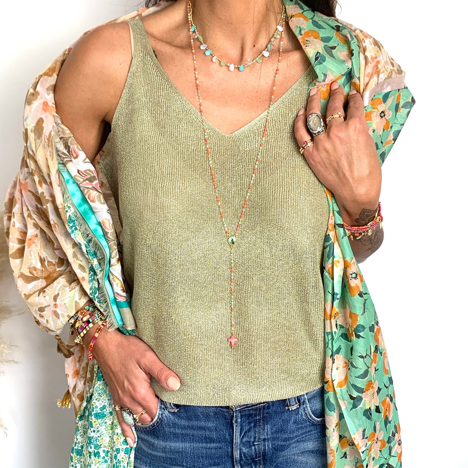 Collier sautoir avec perles de cristal multicolores