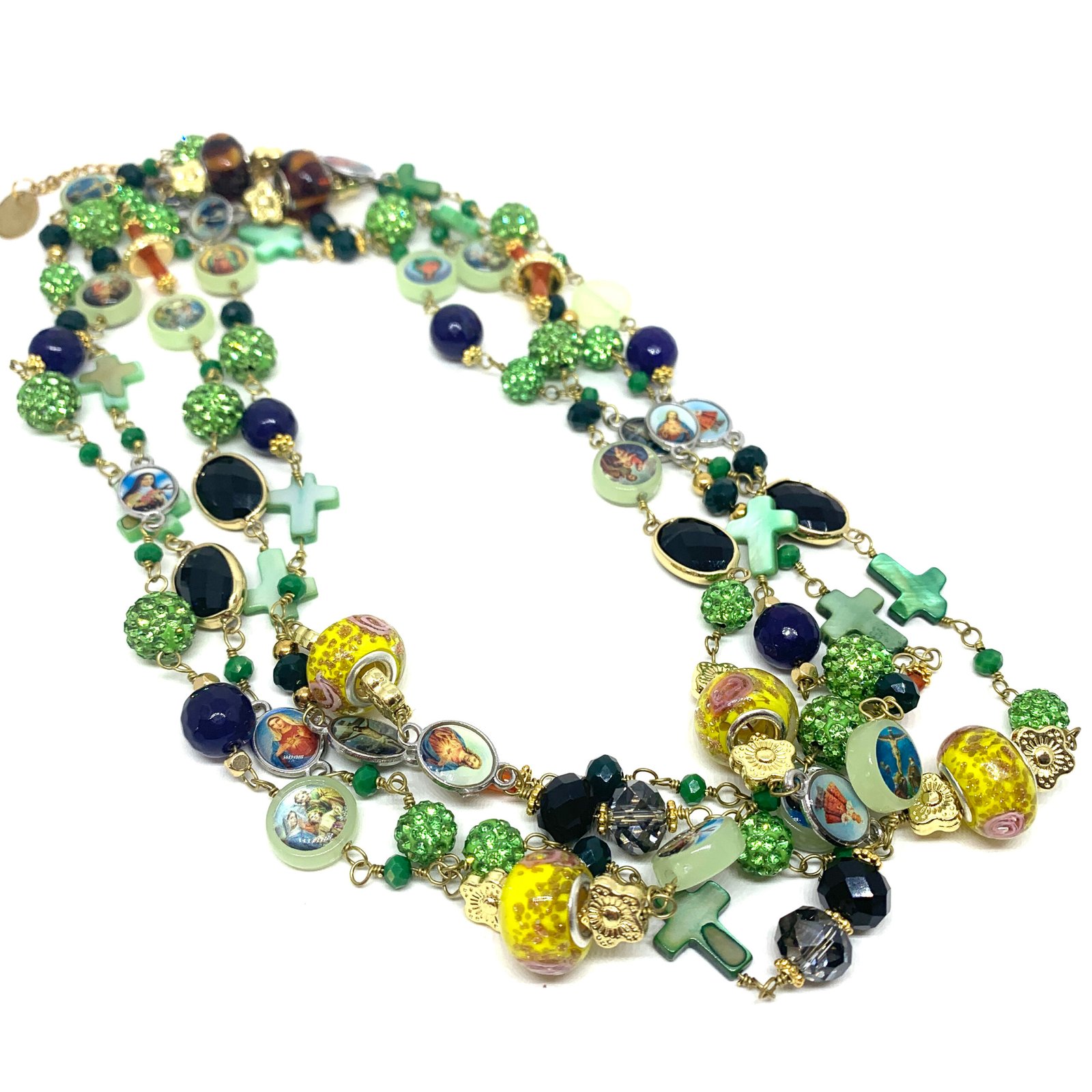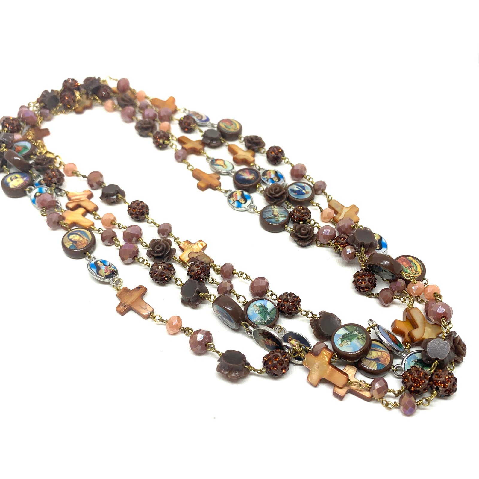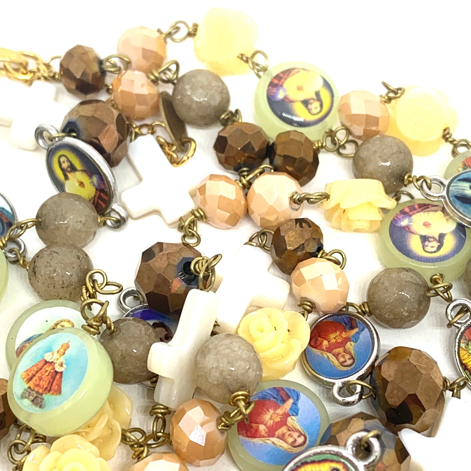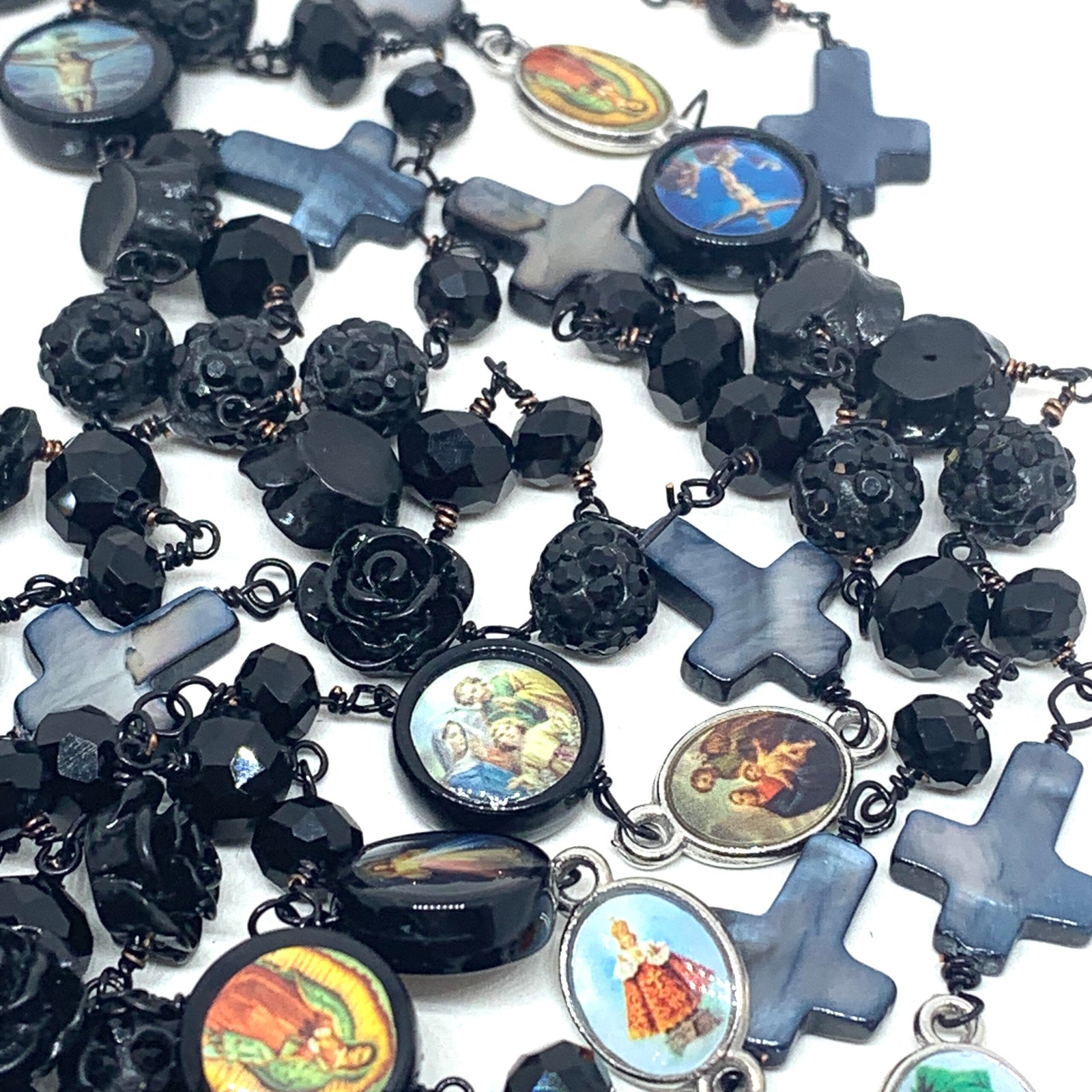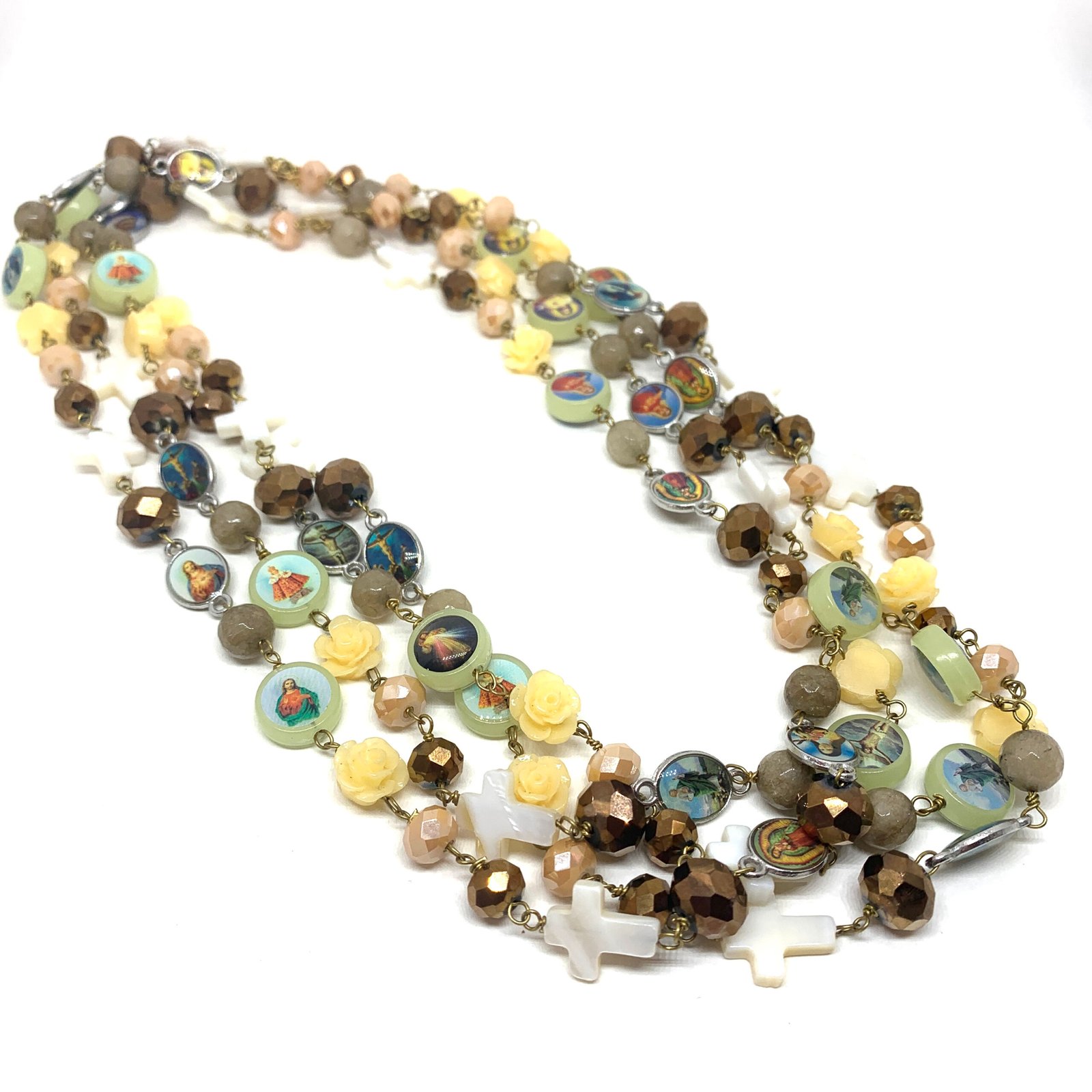 Sautoir composé de perles de verre, de perles facettées, de croix en nacre et de médailles religieuses.