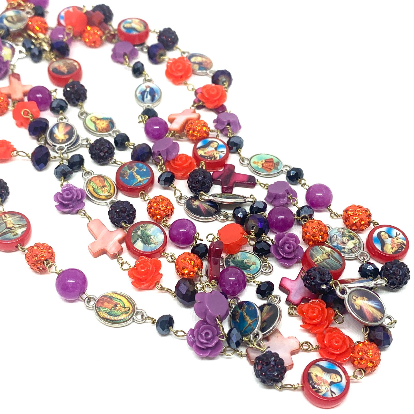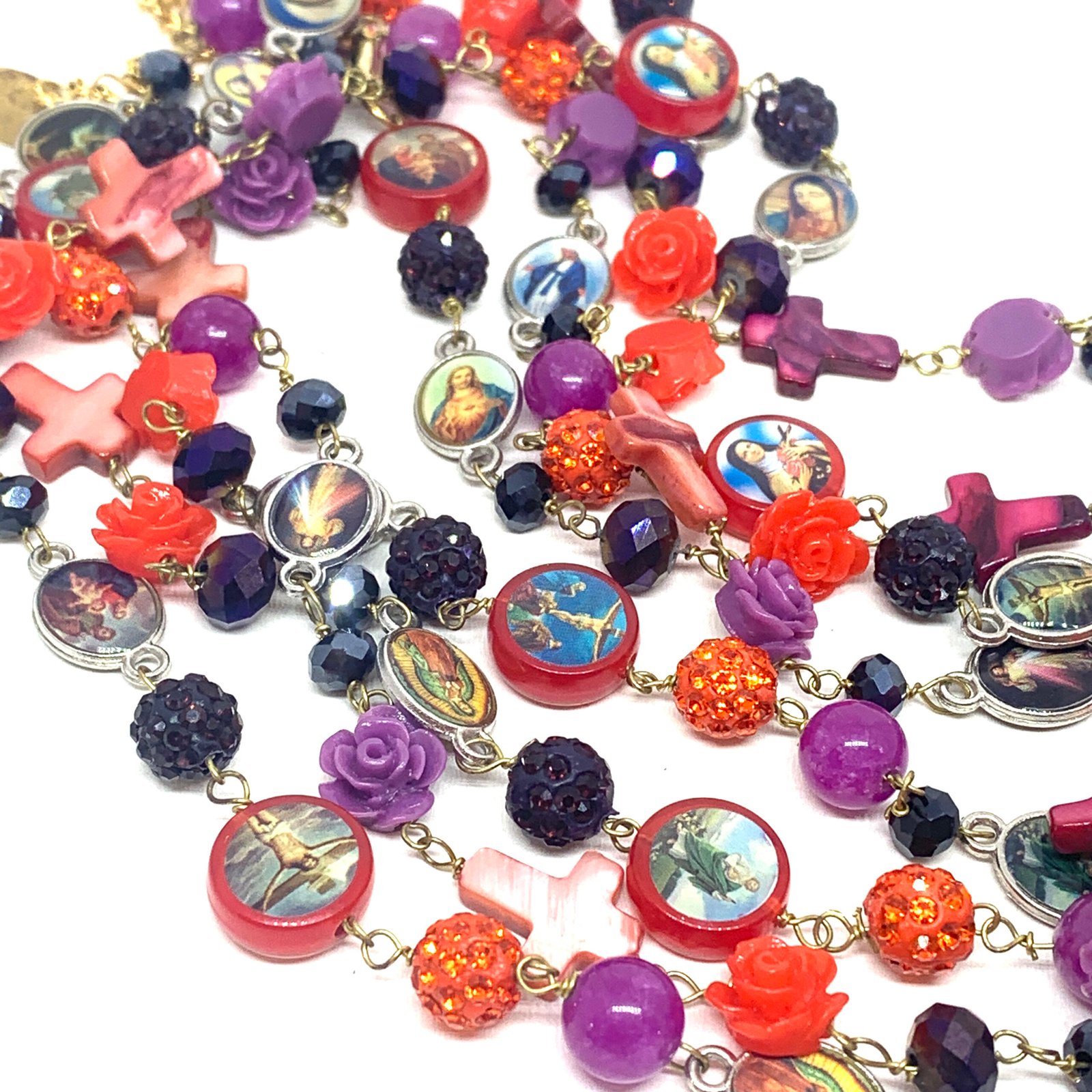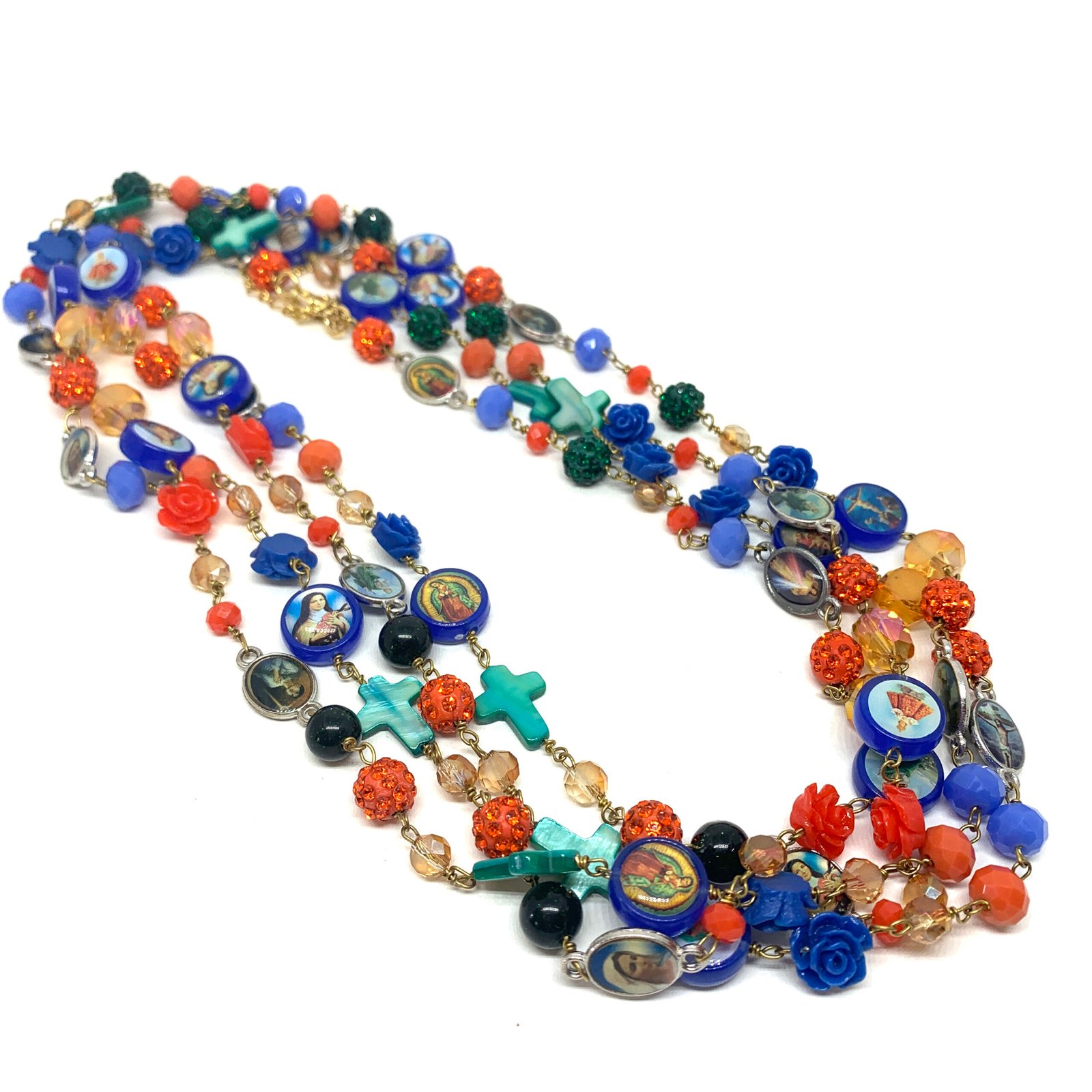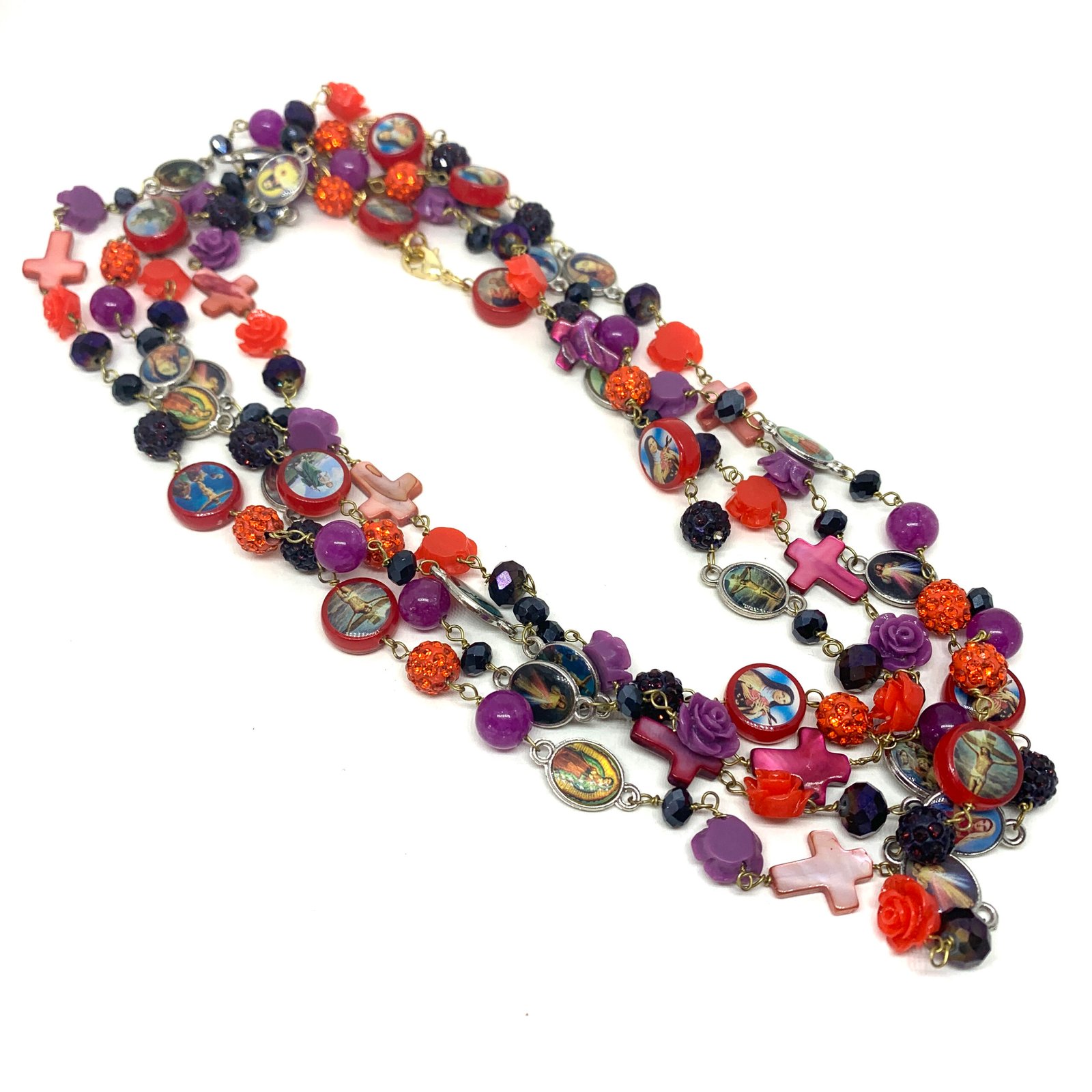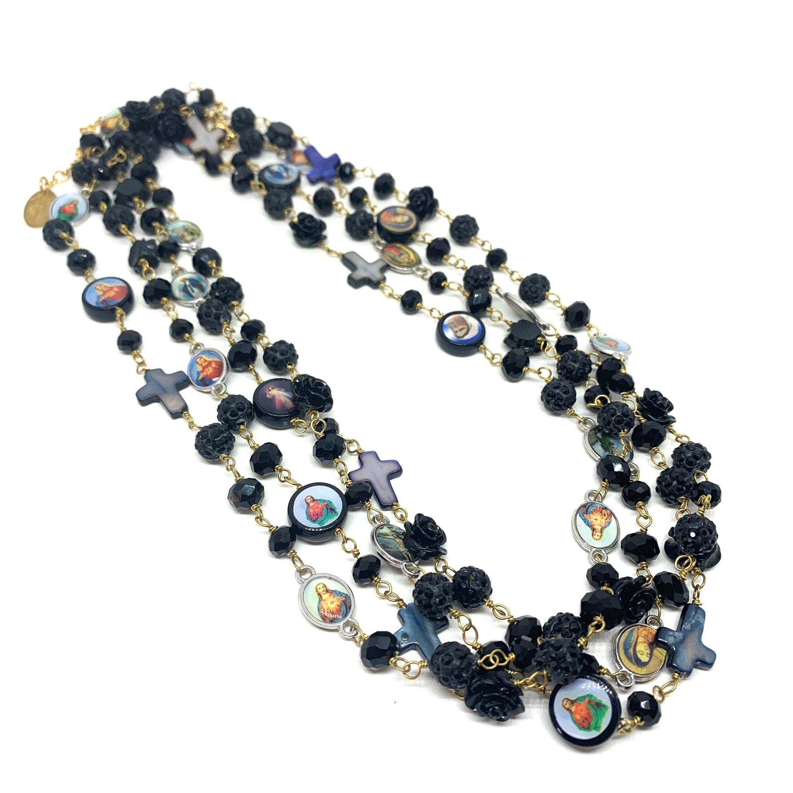 Sautoir composé de perles de verre, de perles facettées, de croix en nacre et de médailles religieuses.