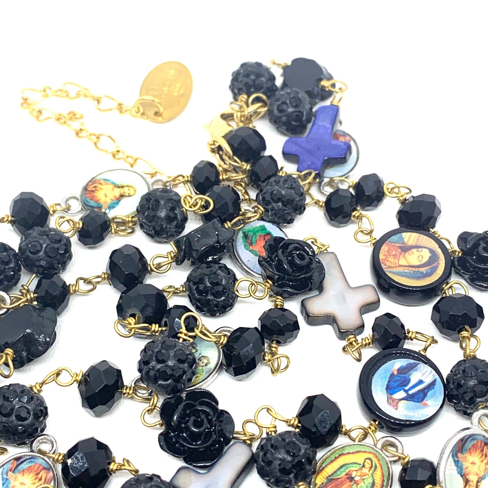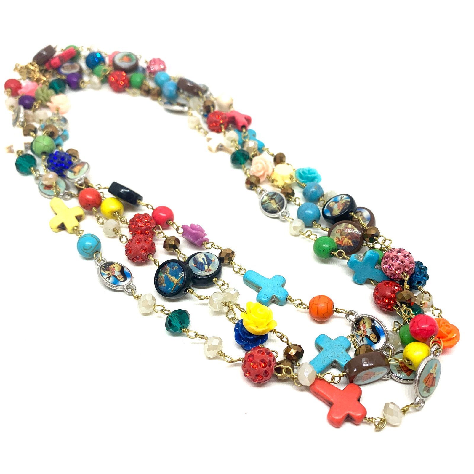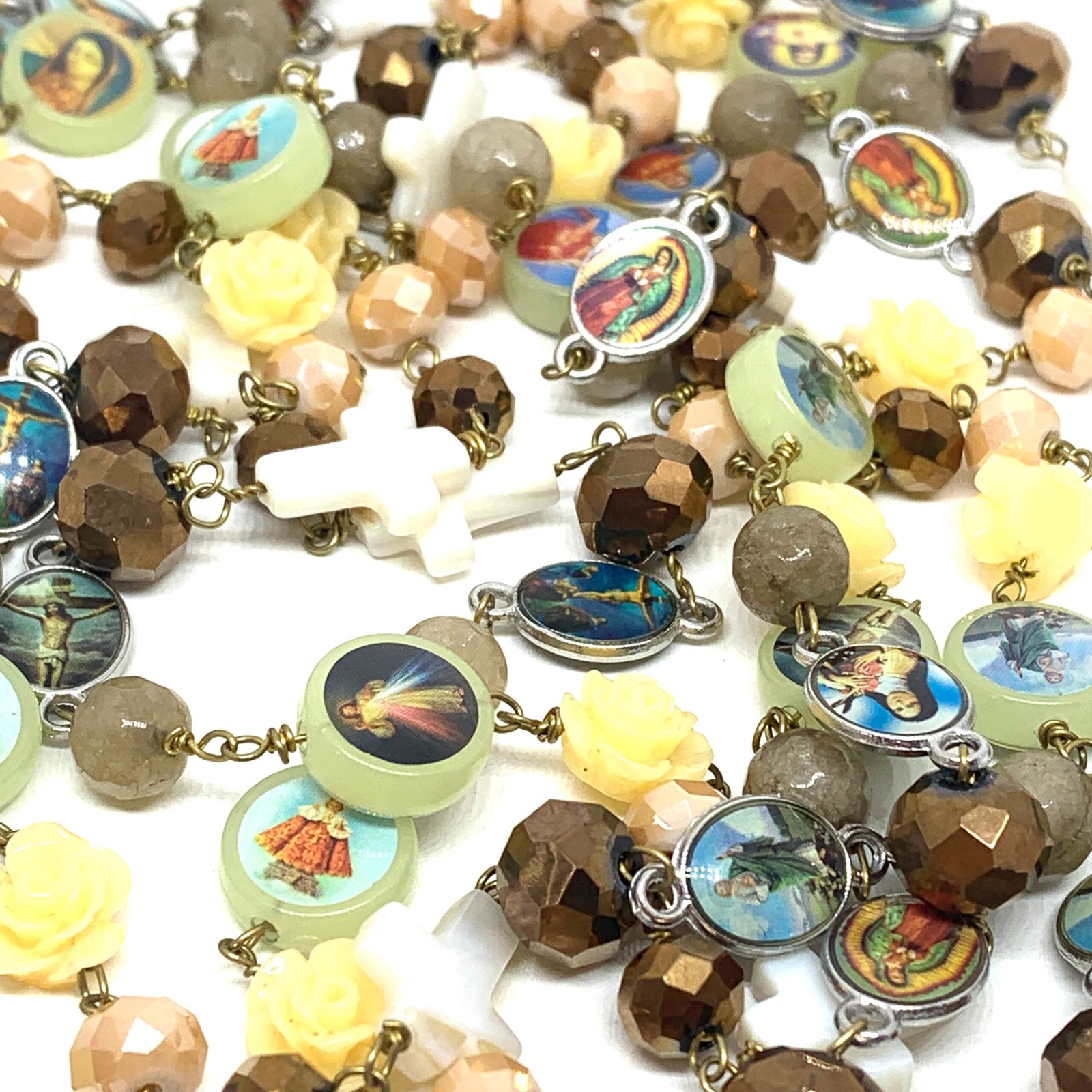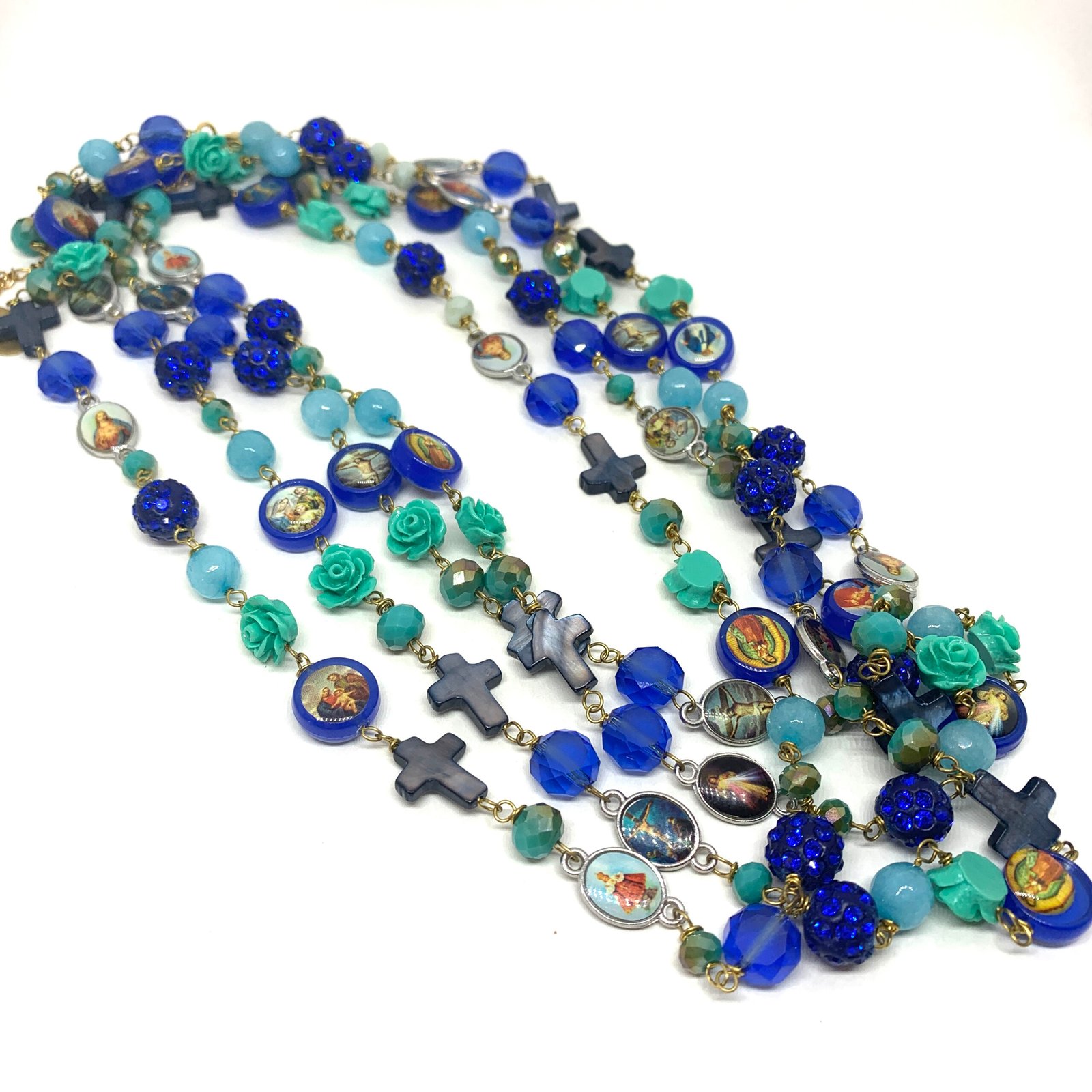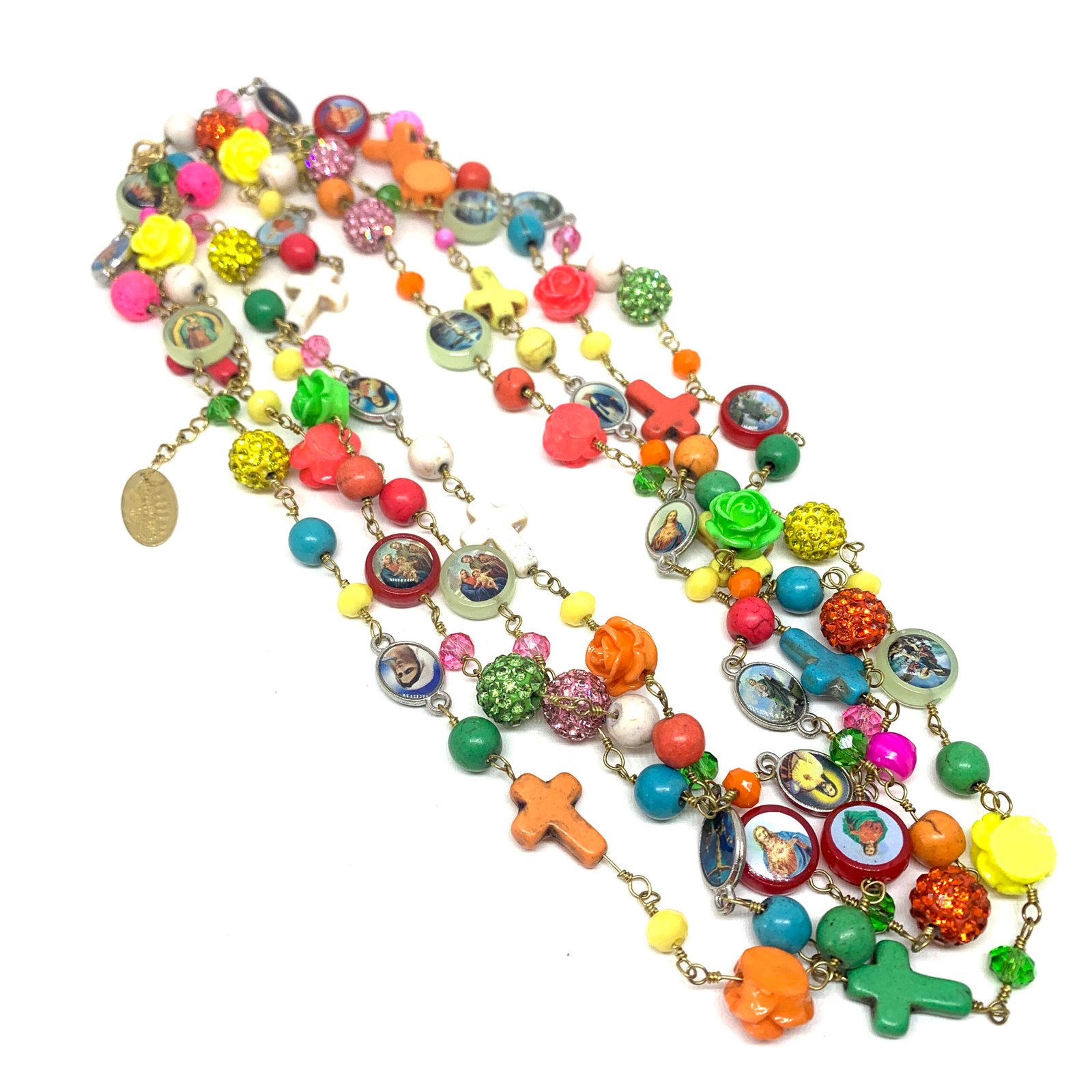 Sautoir composé de perles de verre, de perles facettées, de croix en nacre et de médailles religieuses.