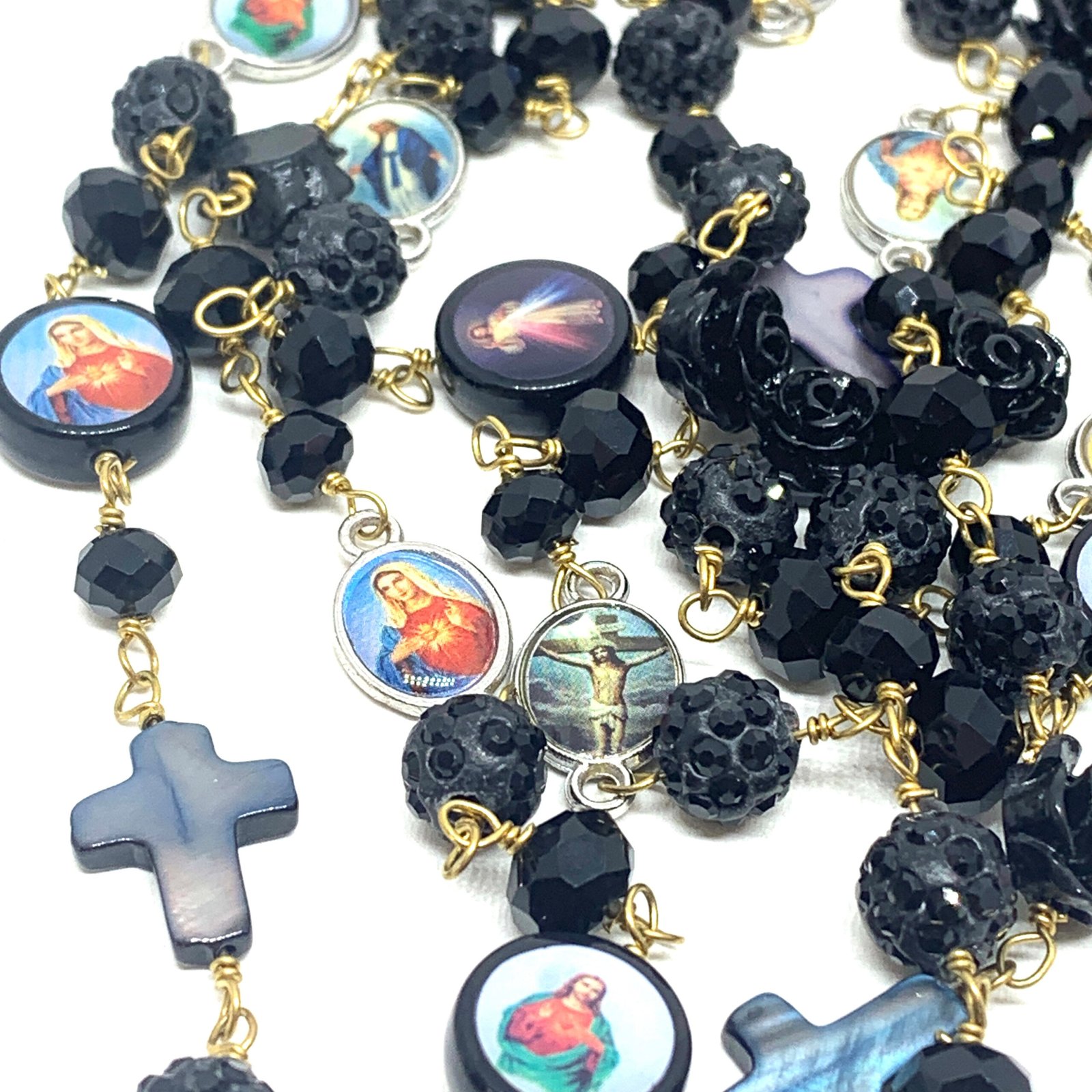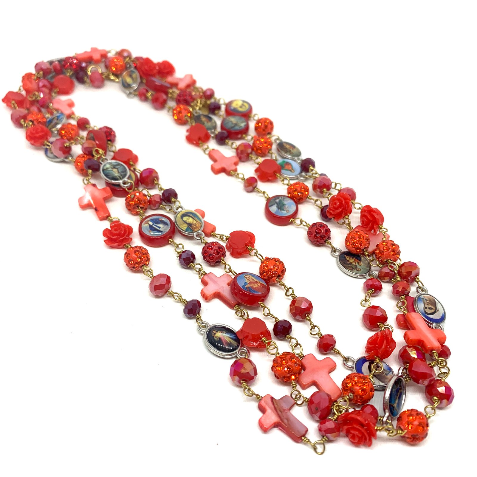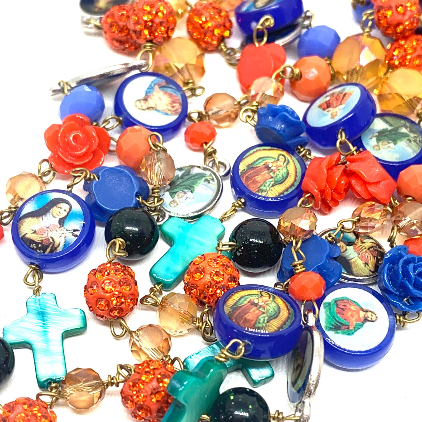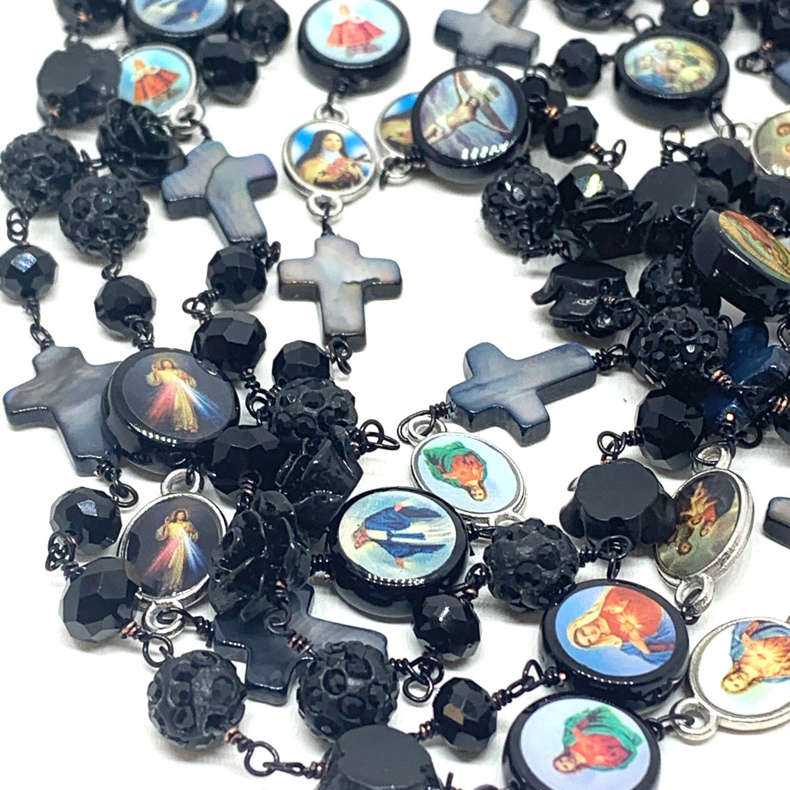 Sautoir composé de perles de verre, de perles facettées, de croix en nacre et de médailles religieuses.