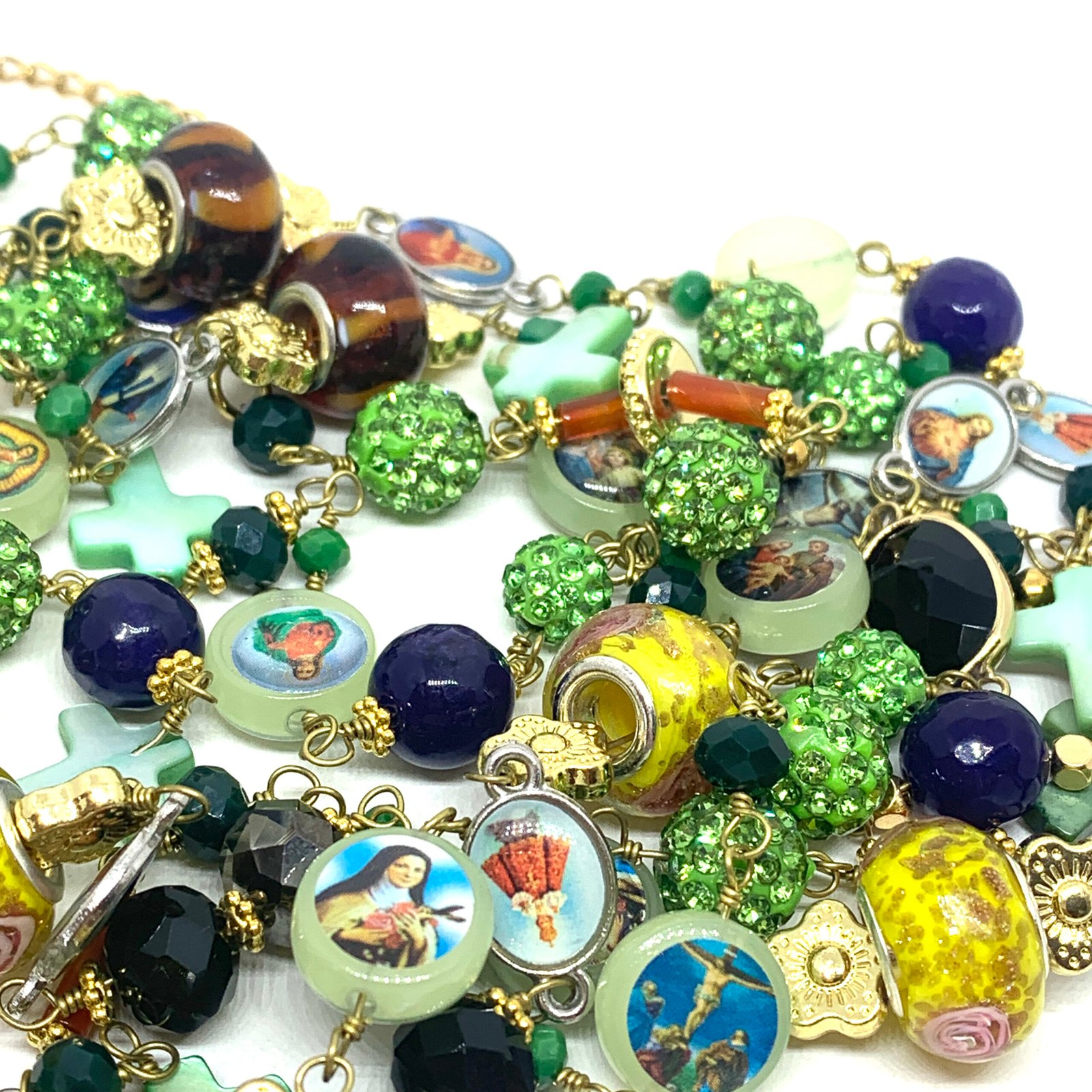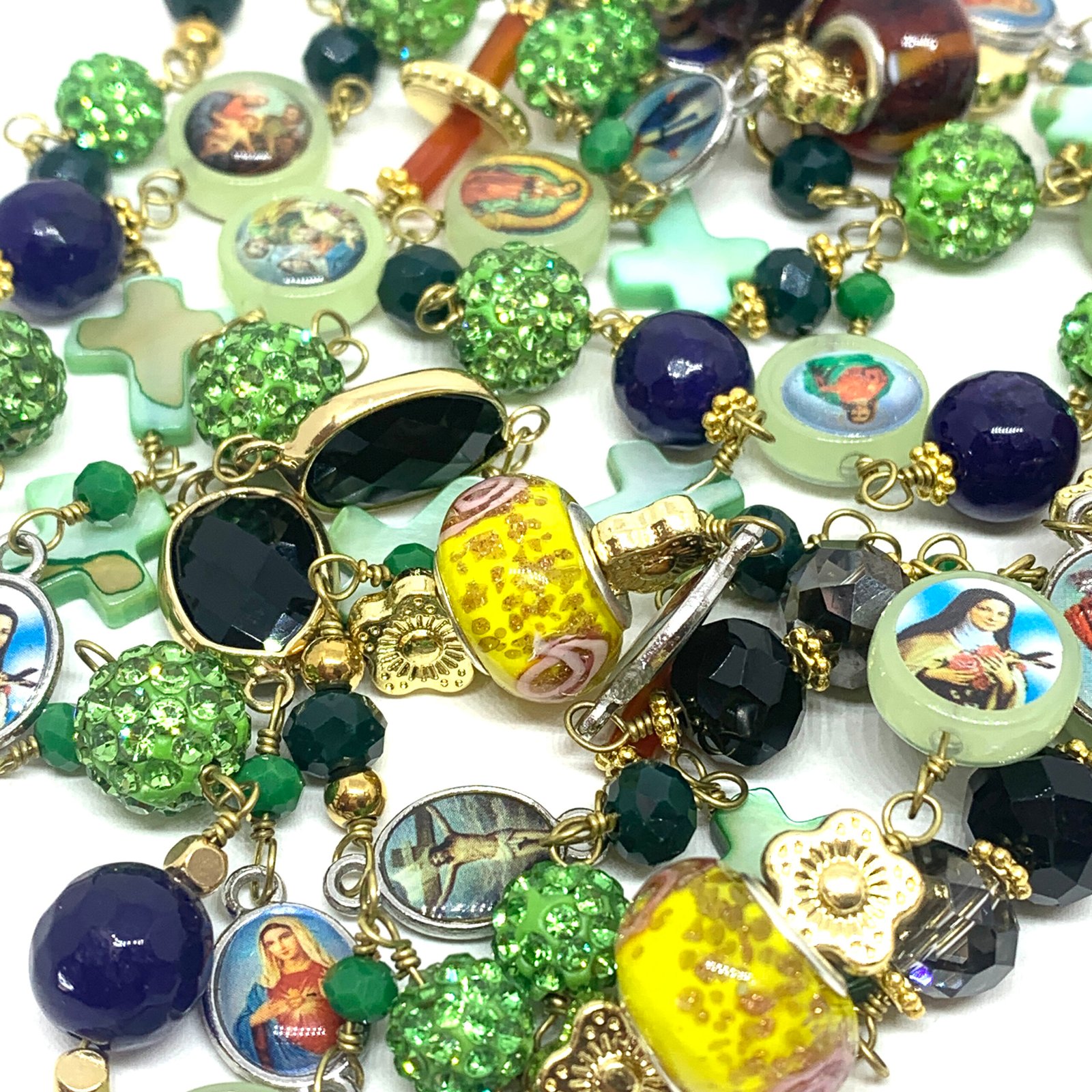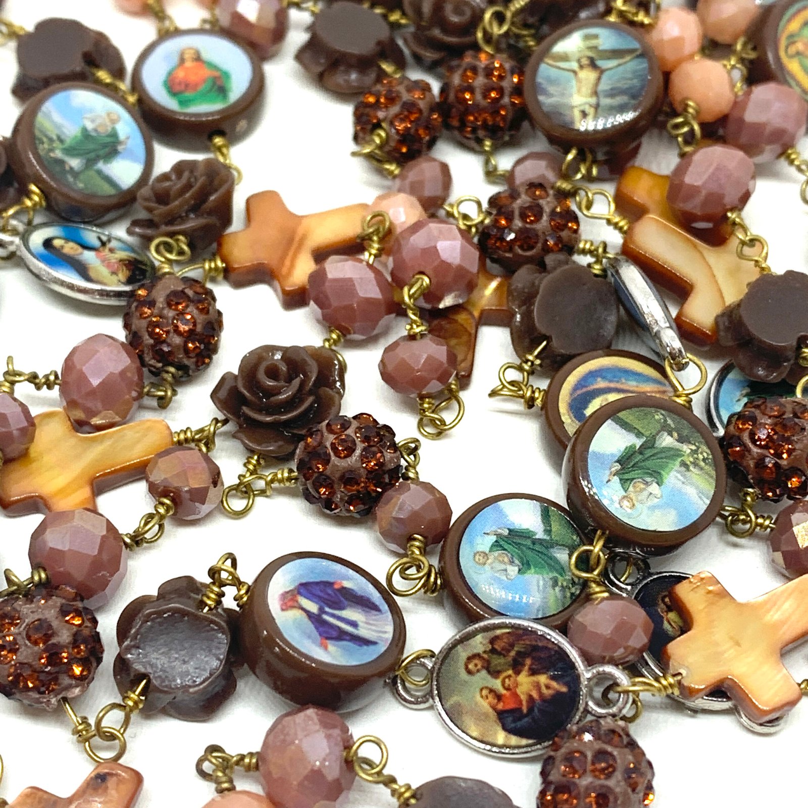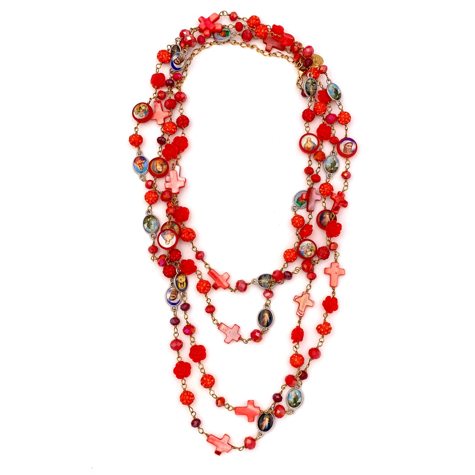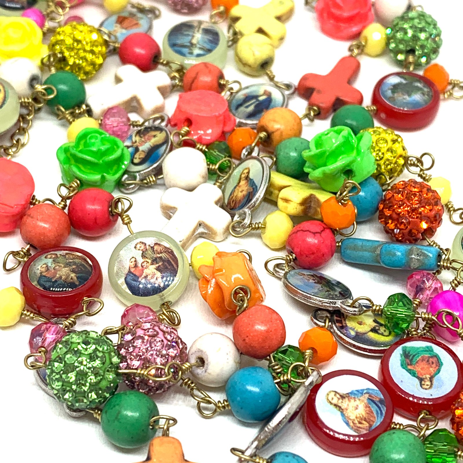 Sautoir composé de perles de verre, de perles facettées, de croix en nacre et de médailles religieuses.