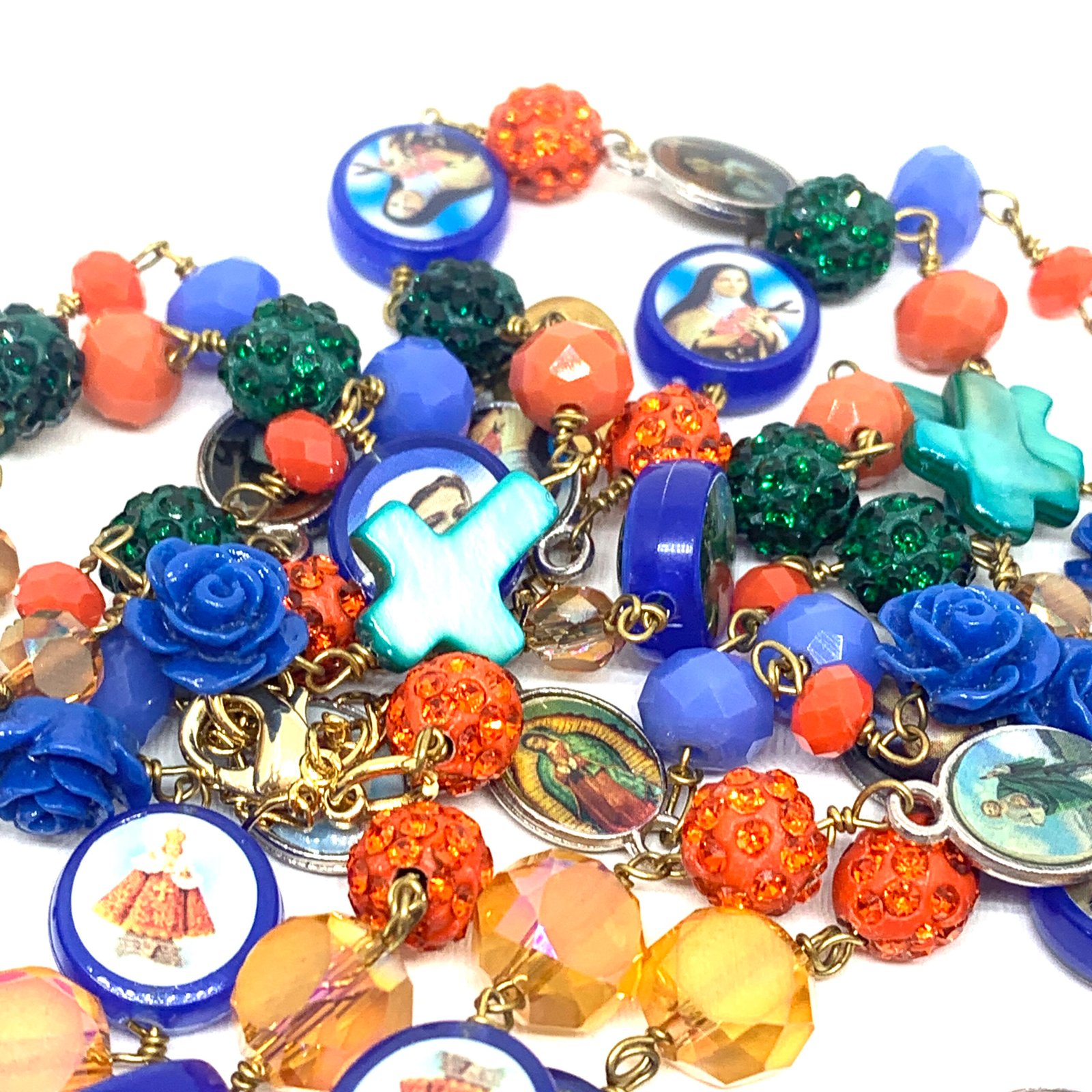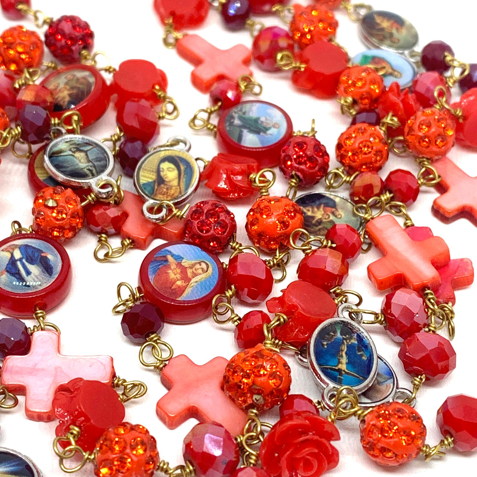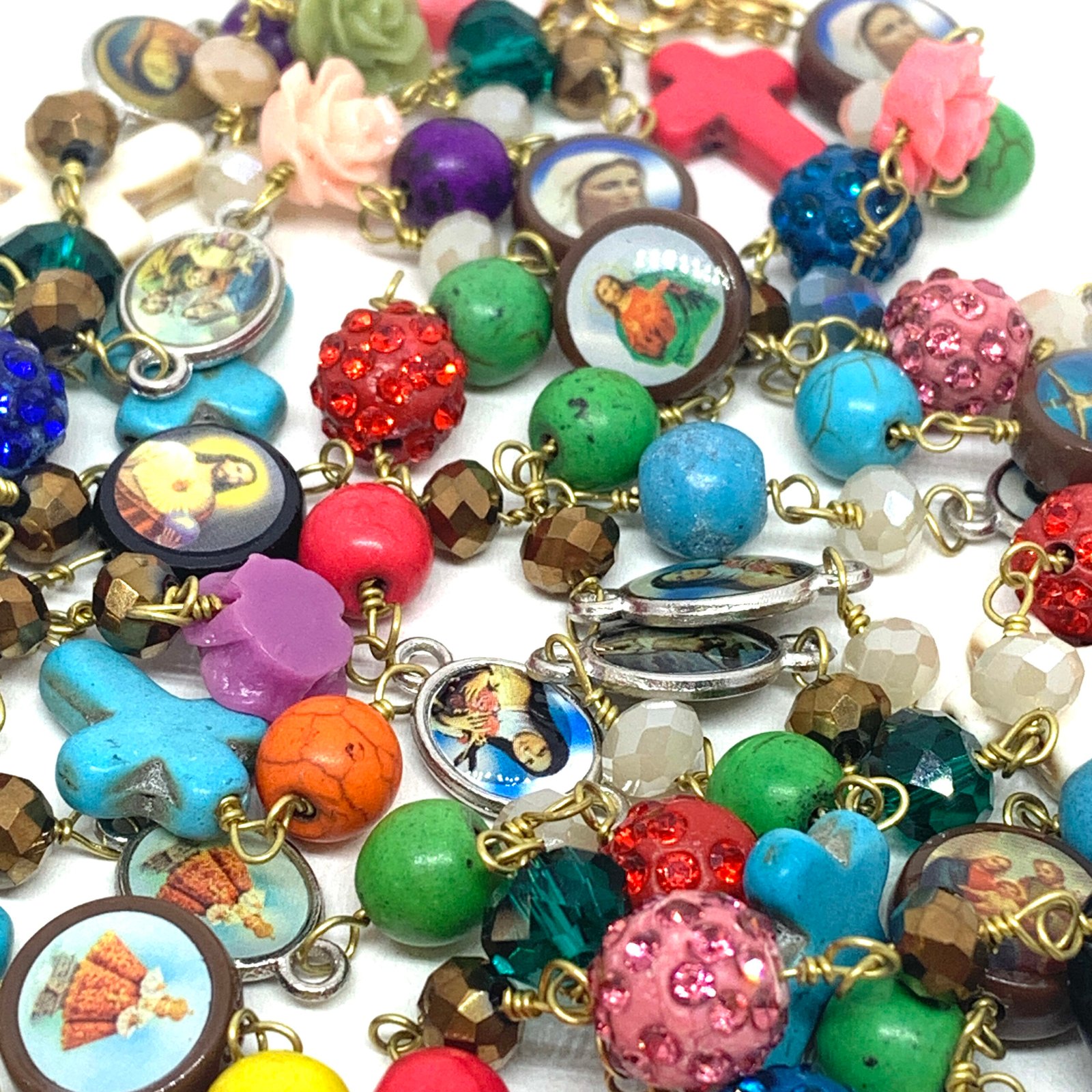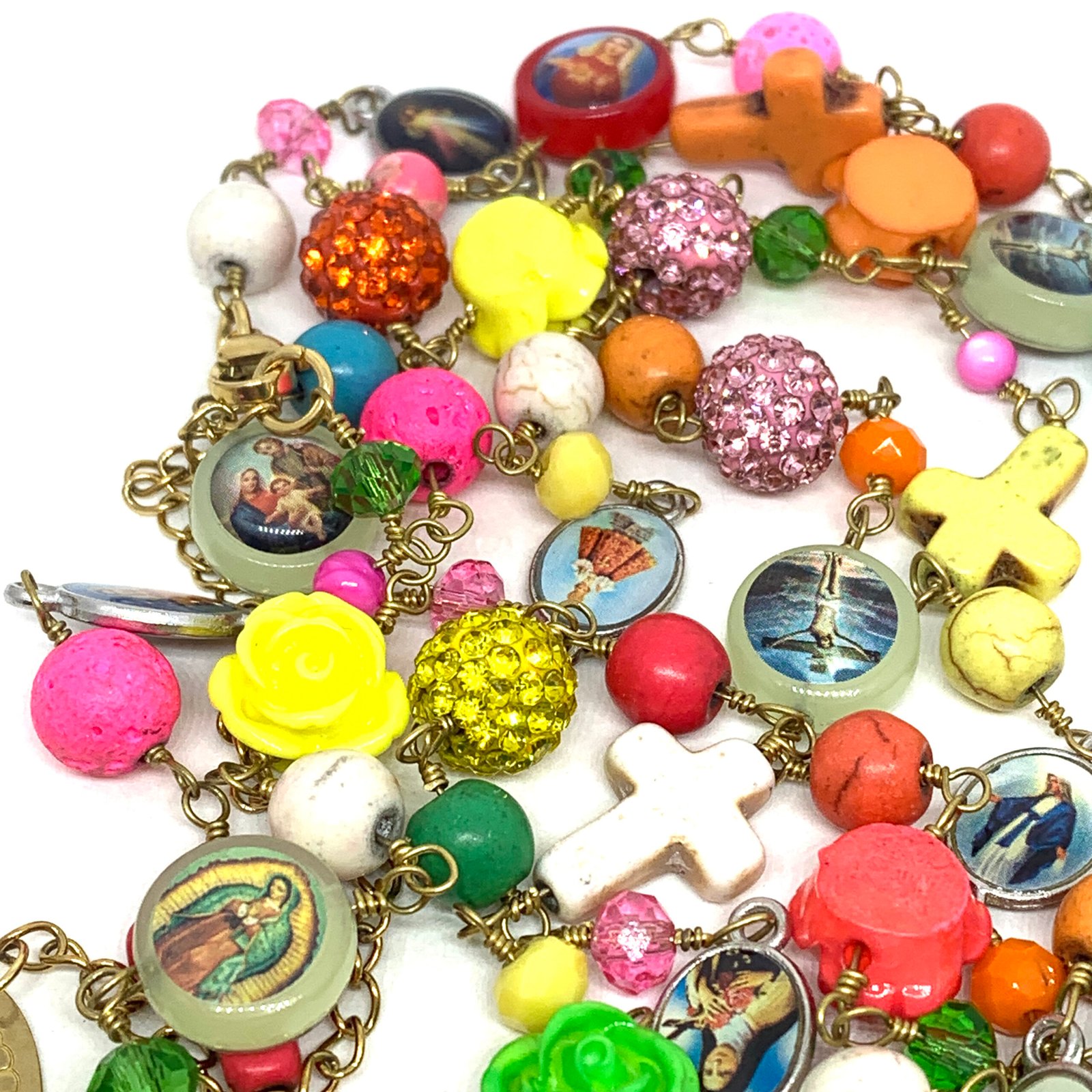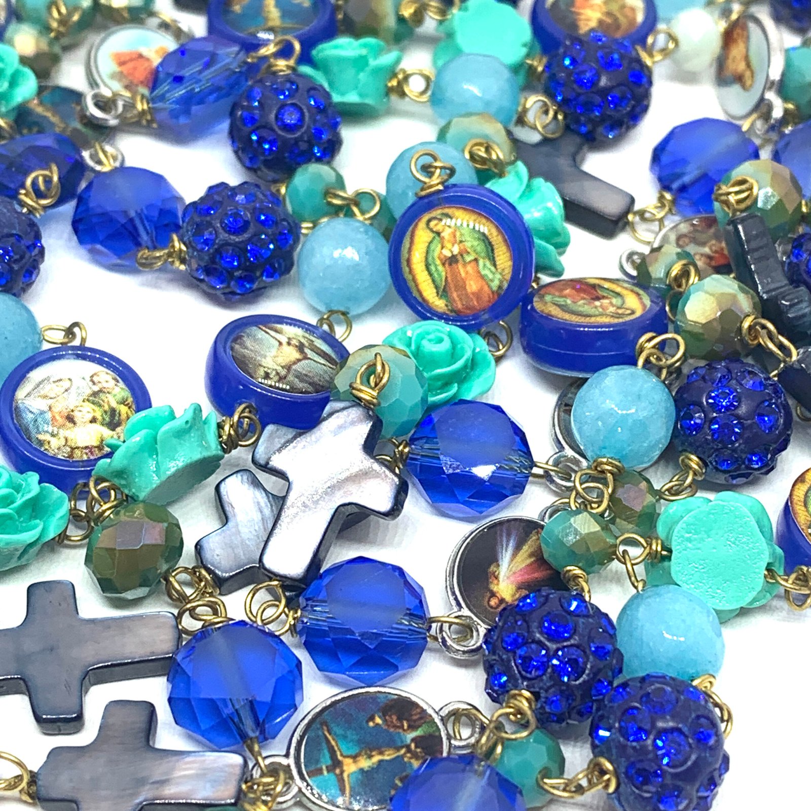 Sautoir composé de perles de verre, de perles facettées, de croix en nacre et de médailles religieuses.