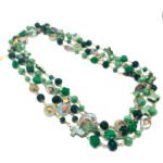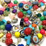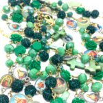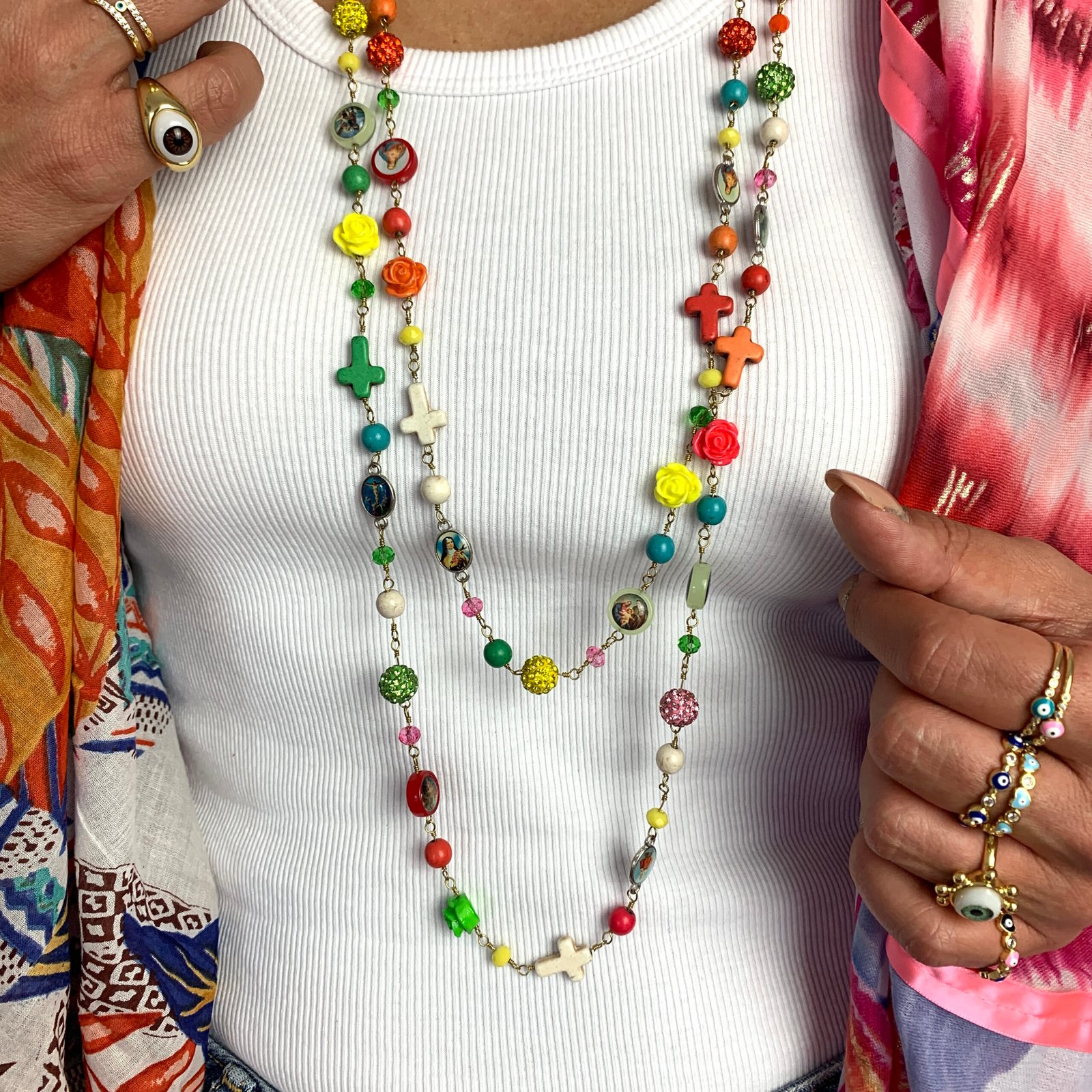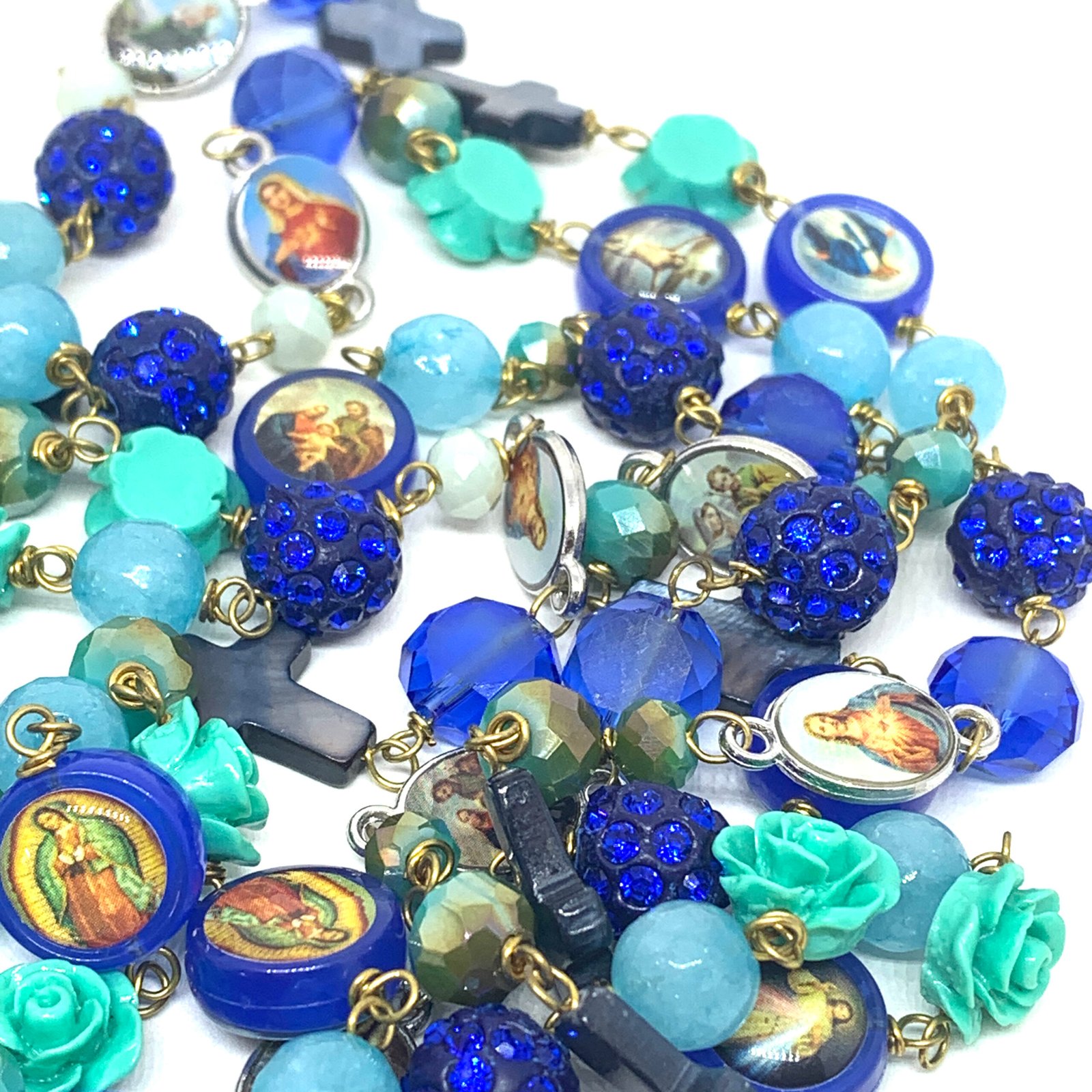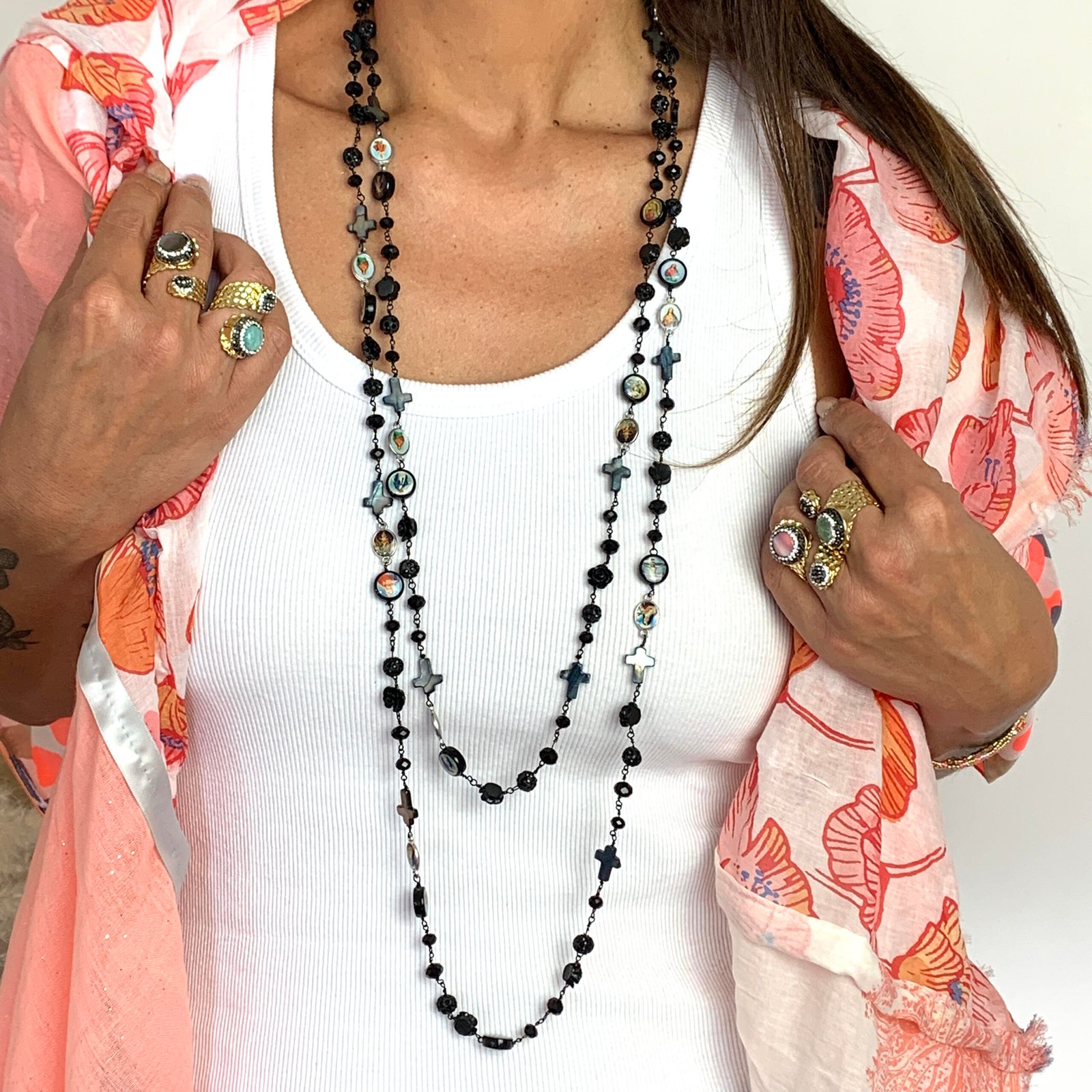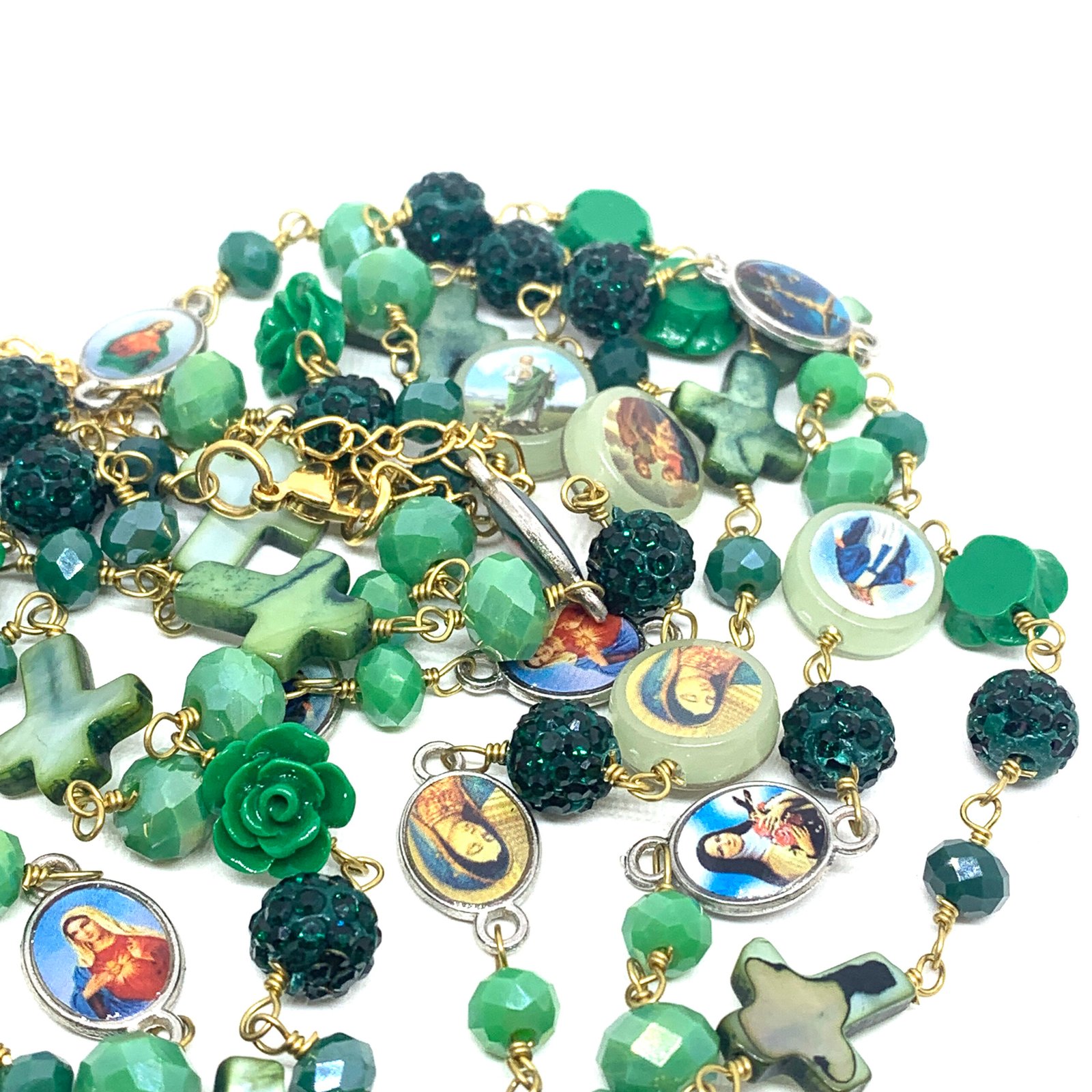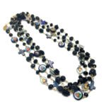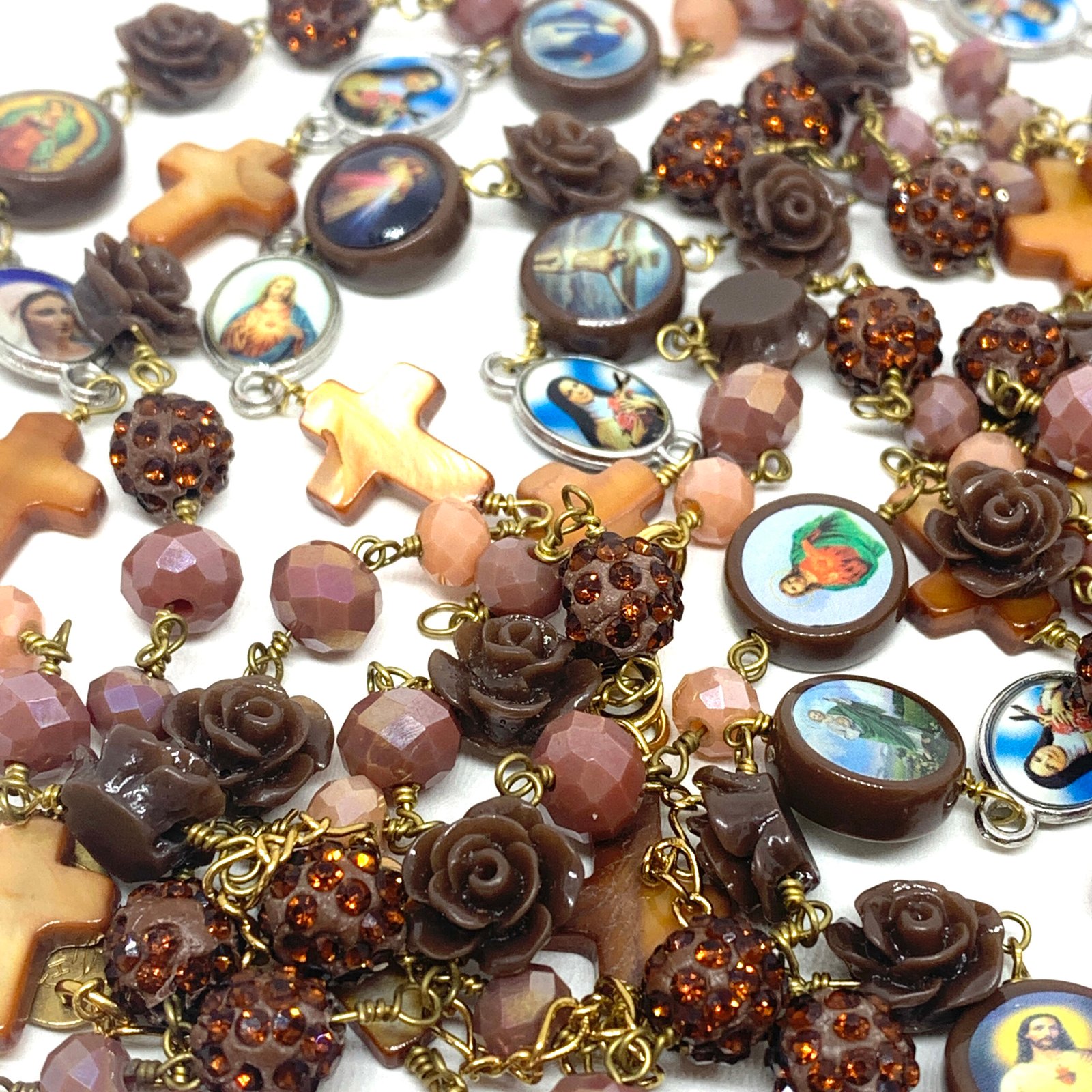 Sautoir composé de perles de verre, de perles facettées, de croix en nacre et de médailles religieuses.